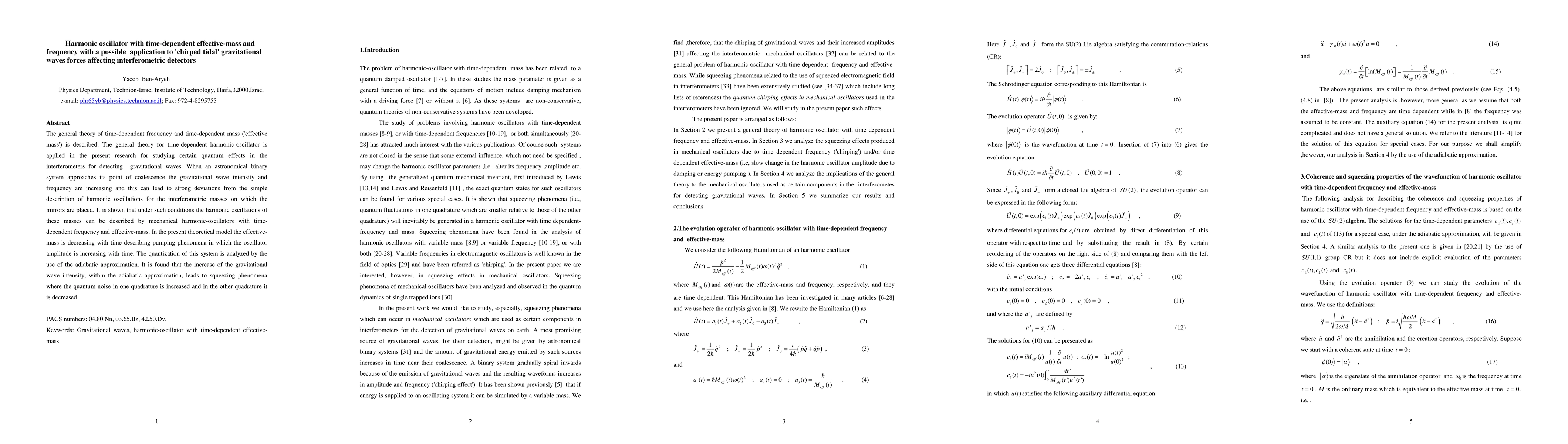 The general theory of time-dependent frequency and time-dependent mass ('effective mass') is described.The general theory for time-dependent harmonic- oscillator is applied in the present research for studying certain quantum effects in the interferometers for detecting gravitational waves.When an astronomical binary system approaches its point of coalescence the gravitational wave intensity and frequency are increasing and this can lead to strong deviations from the simple description of harmonic-oscillations for the interferometric masses on which the mirrors are placed.It is shown that under such condtions the harmonic-oscillations of these masses can be described by mechanical harmonic-oscillators with time-dependent frequency and effective-mass. In the present theoretical model the effective-mass is decreasing with time describing pumping phenomena in which the oscillator amplitude is increasing with time . The quantization of this system is analyzed by the use of the adiabatic approximation. It is found that the increase of the gravitational wave intensity, within the adiabatic approximation, leads to squeezing phenomena where the quantum noise in one quadrature is increased and in the other quadrature is decreased.