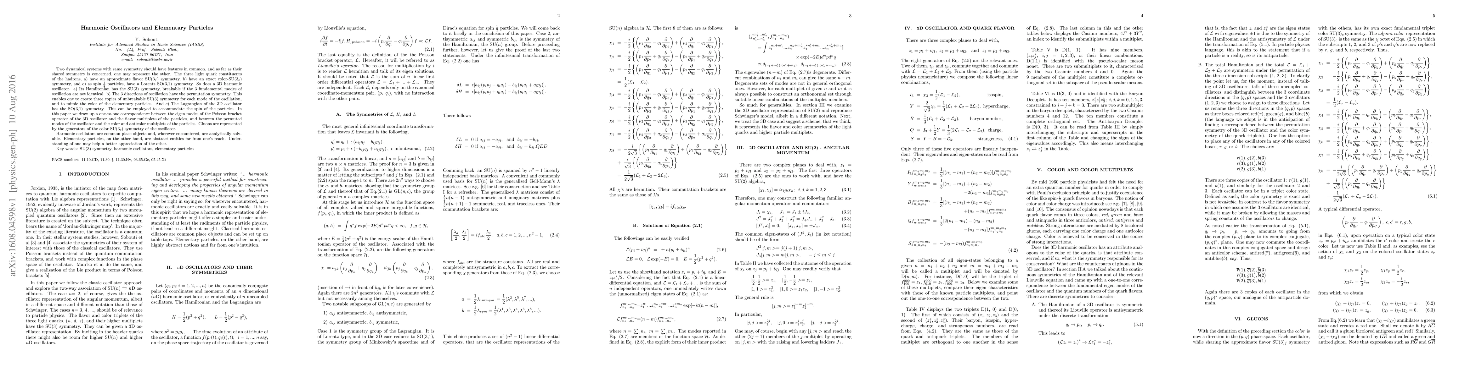 Two dynamical systems with same symmetry should have features in common, and as far as their shared symmetry is concerned, one may represent the other. The three light quark constituents of the hadrons, a) have an approximate flavor SU(3) symmetry, b) have an exact color SU(3) symmetry, and c) as spin 1/2 particles, have a Lorentz SO(3,1) symmetry. So does a 3D harmonic oscillator. a) Its Hamiltonian has the SU(3) symmetry, breakable if the 3 fundamental modes of oscillation are not identical. b) The 3 directions of oscillation have the permutation symmetry. This enables one to create three copies of unbreakable SU(3) symmetry for each mode of the oscillation, and mimic the color of the elementary particles. And c) The Lagrangian of the 3D oscillator has the SO(3,1) symmetry. This can be employed to accommodate the spin of the particles. In this paper we draw up a one-to-one correspondence between the eigen modes of the Poisson bracket operator of the 3D oscillator and the flavor multiplets of the particles, and between the permuted modes of the oscillator and the color and anticolor multiplets of the particles. Gluons are represented by the generators of the color SU(3) symmetry of the oscillator. Harmonic oscillators are common place objects and, wherever encountered, are analytically solvable. Elementary particles, on the other hand, are abstract entities far from one's reach. Understanding of one may help a better appreciation of the other.
