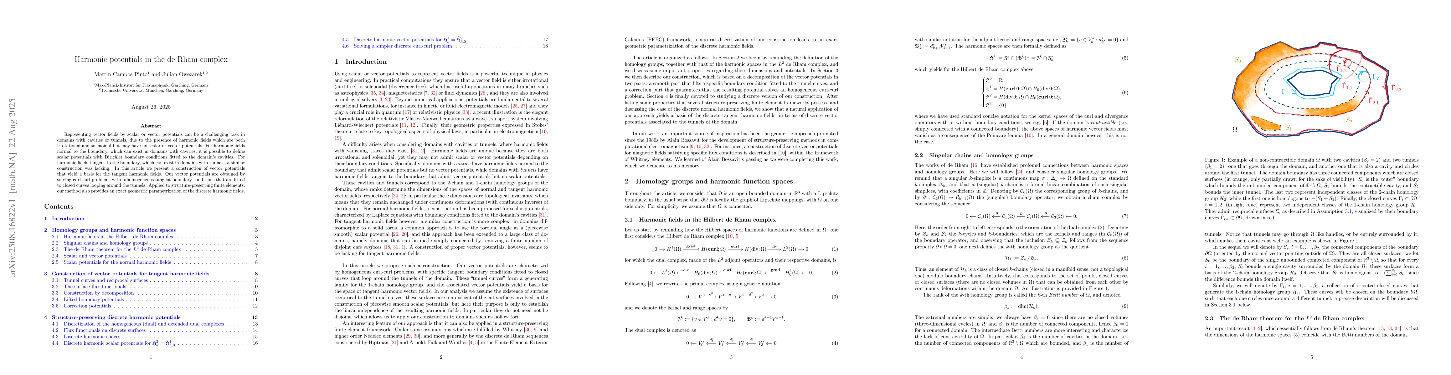 Representing vector fields by scalar or vector potentials can be a challenging task in domains with cavities or tunnels, due to the presence of harmonic fields which are both irrotational and solenoidal but may have no scalar or vector potentials. For harmonic fields normal to the boundary, which can exist in domains with cavities, it is possible to define scalar potentials with Dirichlet boundary conditions fitted to the domain's cavities. For harmonic fields tangent to the boundary, which can exist in domains with tunnels, a similar construction was lacking. In this article we present a construction of vector potentials that yield a basis for the tangent harmonic fields. Our vector potentials are obtained by solving curl-curl problems with inhomogeneous tangent boundary conditions that are fitted to closed curves looping around the tunnels. Applied to structure-preserving finite elements, our method also provides an exact geometric parametrization of the discrete harmonic fields.