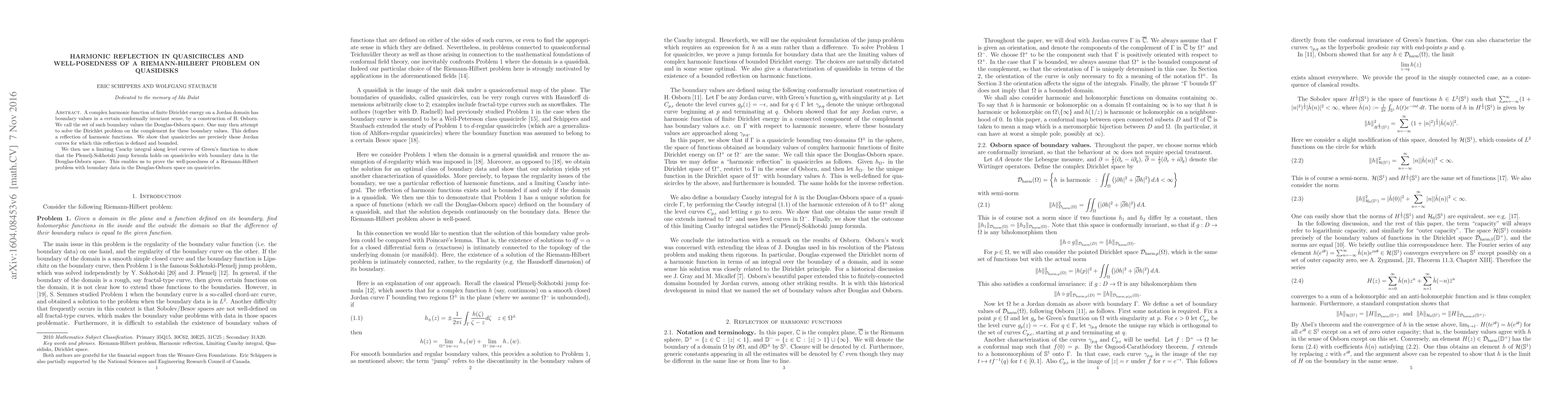A complex harmonic function of finite Dirichlet energy on a Jordan domain has boundary values in a certain conformally invariant sense, by a construction of H. Osborn. We call the set of such boundary values the Douglas-Osborn space. One may then attempt to solve the Dirichlet problem on the complement for these boundary values. This defines a reflection of harmonic functions. We show that quasicircles are precisely those Jordan curves for which this reflection is defined and bounded. We then use a limiting Cauchy integral along level curves of Green's function to show that the Plemelj-Sokhotski jump formula holds on quasicircles with boundary data in the Douglas-Osborn space. This enables us to prove the well-posedness of a Riemann-Hilbert problem with boundary data in the Douglas-Osborn space on quasicircles.
