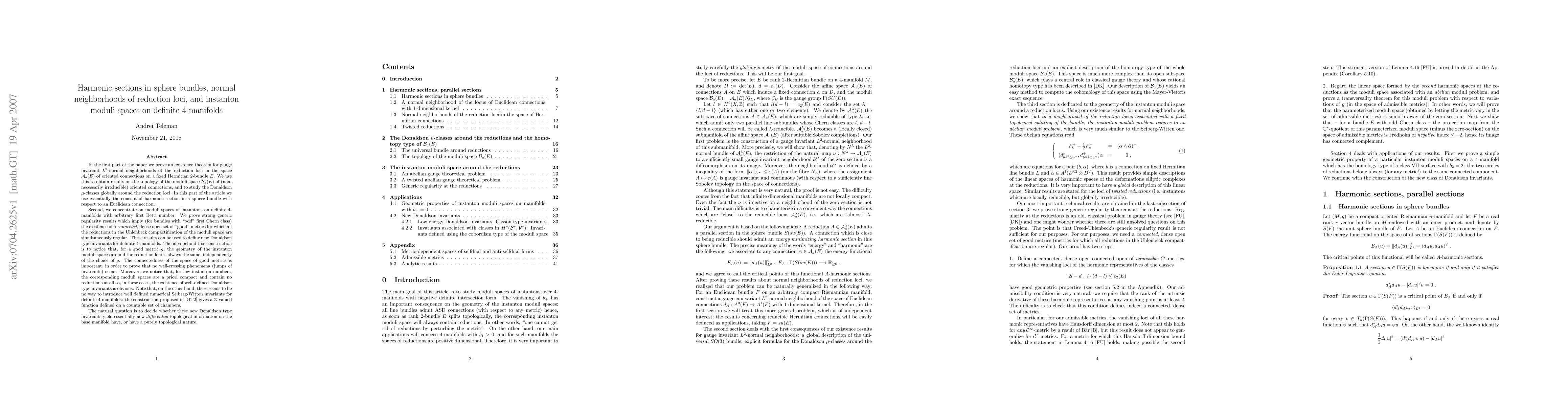 The paper establishes existence theorems for gauge invariant $L^2$-normal neighborhoods of reduction loci in connection spaces and uses harmonic sections in sphere bundles to study the topology of instanton moduli spaces on definite 4-manifolds, proving strong regularity results and defining new Donaldson type invariants.
