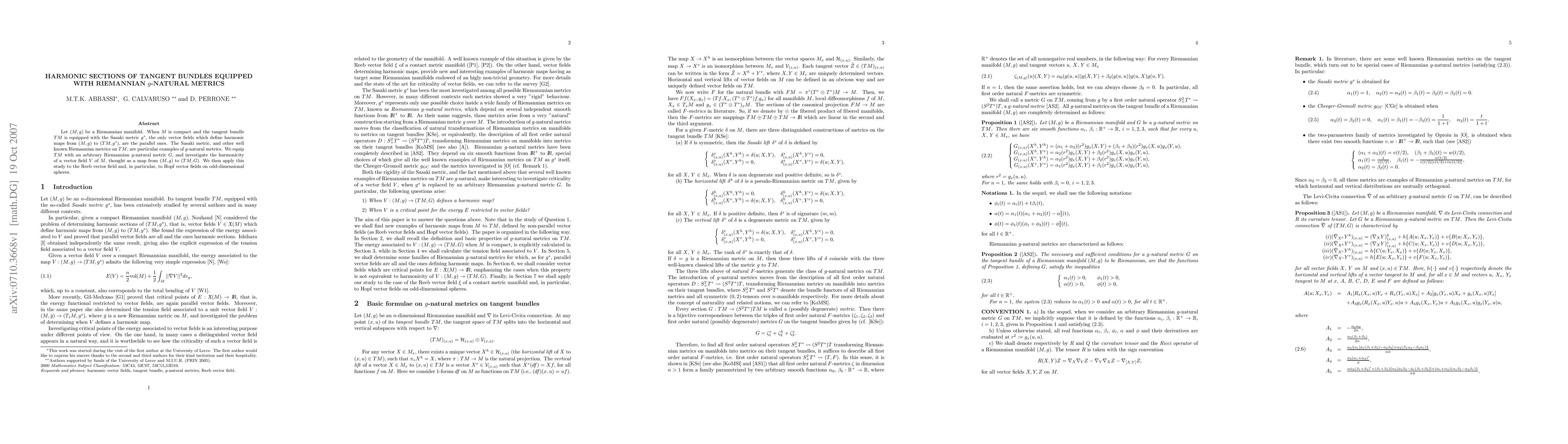 This paper investigates harmonic sections of tangent bundles equipped with $g$-natural metrics, specifically focusing on the Sasaki metric. It finds that only parallel vector fields define harmonic maps from a compact Riemannian manifold to its tangent bundle under the Sasaki metric. The study extends to general $g$-natural metrics and applies the findings to Reeb and Hopf vector fields on odd-dimensional spheres.