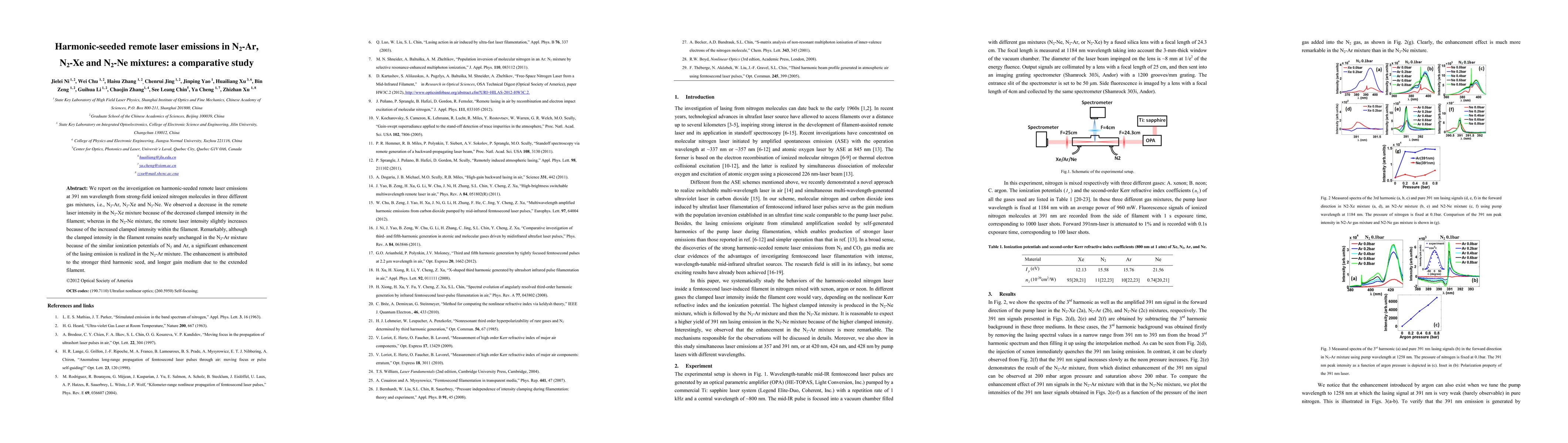 This study investigates harmonic-seeded remote laser emissions from ionized nitrogen molecules in N2-Ar, N2-Xe, and N2-Ne gas mixtures, finding that while N2-Xe and N2-Ne mixtures show decreased or increased remote laser intensity respectively, the N2-Ar mixture exhibits a significant enhancement due to a stronger third harmonic seed and an extended filament.