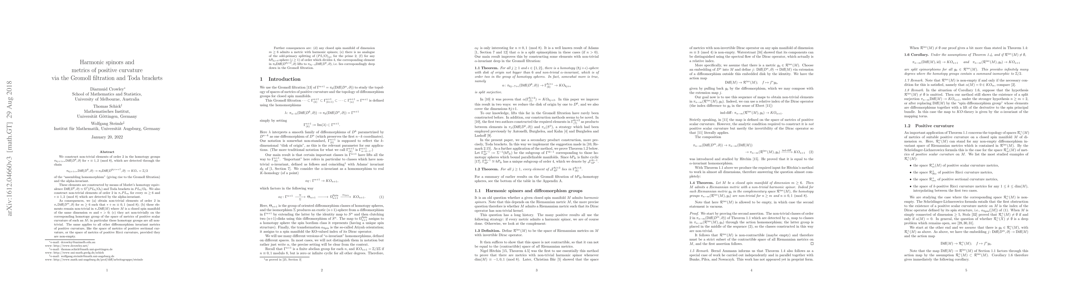 We construct non-trivial elements of order 2 in the homotopy groups $\pi_{8j+1+*} Diff(D^6,\partial)$, for * congruent 1 or 2 modulo 8, which are detected by the "assembling homomorphism" (giving rise to the Gromoll filtration), followed by the alpha-invariant in $KO_*=Z/2$. These elements are constructed by means of Morlet's homotopy equivalence between $Diff(D^6,\partial)$ and $\Omega^7(PL_6/O_6)$, and Toda brackets in $PL_6/O_6$. We also construct non-trivial elements of order 2 in $\pi_* PL_m$ for every m greater or equal to 6 and * congruent to 1 or 2 modulo 8, which are detected by the alpha-invariant. As consequences, we (a) obtain non-trivial elements of order 2 in $\pi_* Diff(D^m,\partial)$ for m greater or equal to 6, and * + m congruent 0 or 1 modulo 8; (b) these elements remain non-trivial in $\pi_* Diff(M)$ where M is a closed spin manifold of the same dimension m and * > 0; (c) they act non-trivially on the corresponding homotopy group of the space of metrics of positive scalar curvature of such an M; in particular these homotopy groups are all non-trivial. The same applies to all other diffeomorphism invariant metrics of positive curvature, like the space of metrics of positive sectional curvature, or the space of metrics of positive Ricci curvature, provided they are non-empty. Further consequences are: (d) any closed spin manifold of dimension m greater or equal to 6 admits a metric with harmonic spinors; (e) there is no analogue of the odd-primary splitting of $(PL/O)_{(p)}$ for the prime 2; (f) for any $bP_{8j+4}$-sphere (where j > 0) of order which divides 4, the corresponding element in $\pi_0 Diff(D^{8j+2},\partial)$ lifts to $\pi_{8j-4} Diff(D^6,\partial)$, i.e., lies correspondingly deep down in the Gromoll filtration.