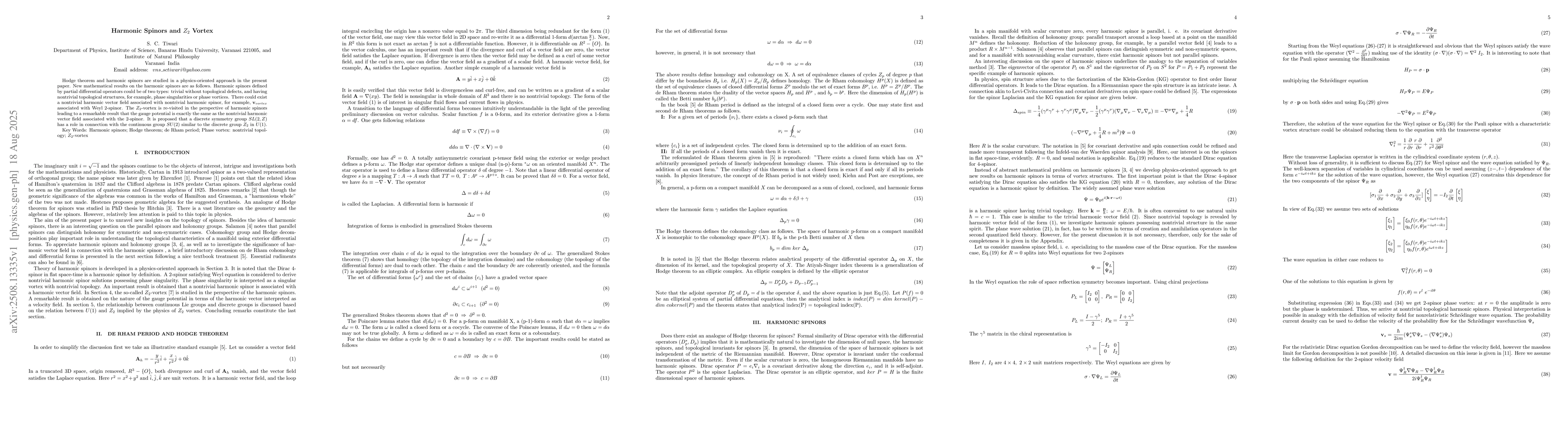 Hodge theorem and harmonic spinors are studied in a physics-oriented approach in the present paper. New mathematical results on the harmonic spinors are as follows. Harmonic spinors defined by partial differential operators could be of two types: trivial without topological defects, and having nontrivial topological structures, for example, phase singularities or phase vortices. There could exist a nontrivial harmonic vector field associated with nontrivial harmonic spinor, for example, ${\bf v}_{vortex}$ associated with Weyl 2-spinor. The $Z_2$-vortex is re-visited in the perspective of harmonic spinors leading to a remarkable result that the gauge potential is exactly the same as the nontrivial harmonic vector field associated with the 2-spinor. It is proposed that a discrete symmetry group $SL(2, Z)$ has a role in connection with the continuous group $SU(2)$ similar to the discrete group $Z_2$ in $U(1)$.