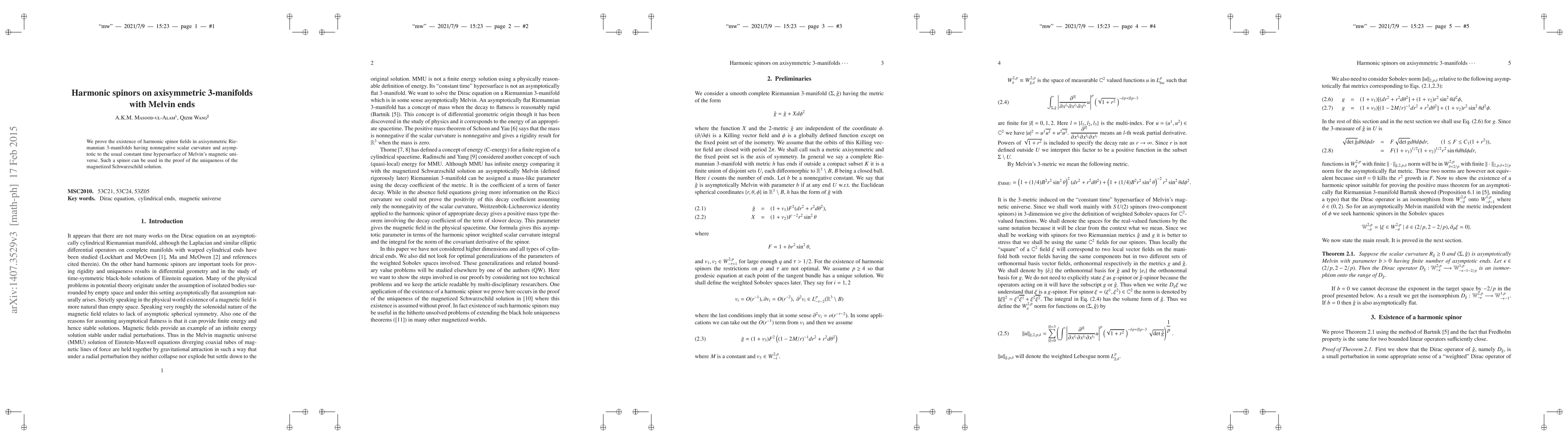 Researchers prove the existence of harmonic spinor fields in axisymmetric 3-manifolds with specific properties, which can aid in proving the uniqueness of a magnetized Schwarzschild solution.