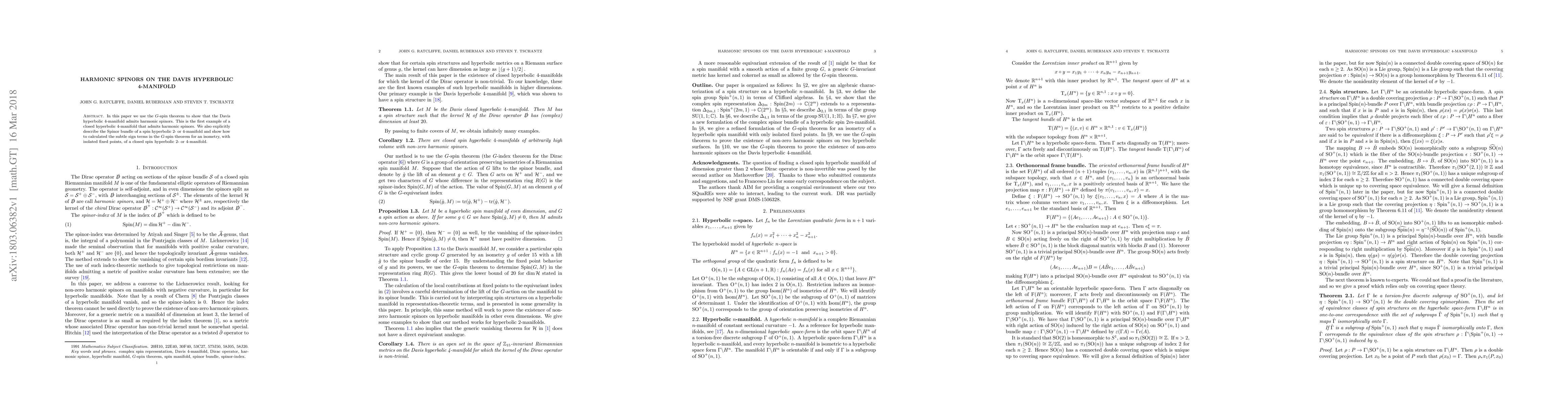 This paper demonstrates the existence of harmonic spinors on the Davis hyperbolic 4-manifold using the G-spin theorem, marking the first instance of such a phenomenon in a closed hyperbolic 4-manifold. It also provides an explicit description of the Spinor bundle for spin hyperbolic 2- or 4-manifolds and details the calculation of sign terms in the G-spin theorem for isometries with isolated fixed points.