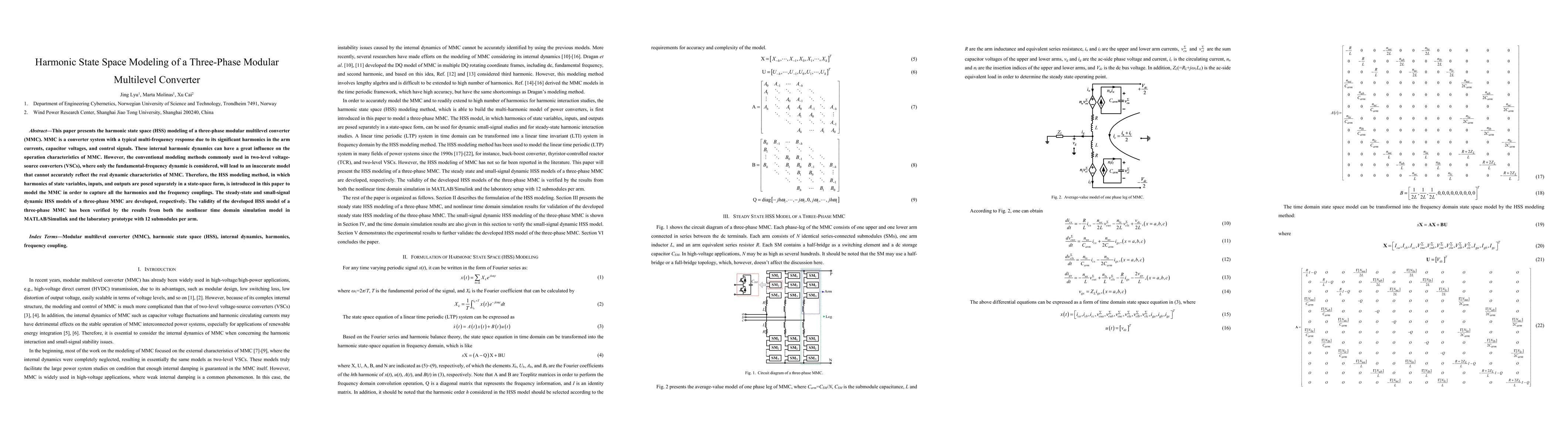 This paper introduces harmonic state space modeling for a three-phase modular multilevel converter (MMC) to accurately capture its multi-frequency dynamics, developing both steady-state and small-signal dynamic models validated through MATLAB/Simulink simulations and a laboratory prototype.