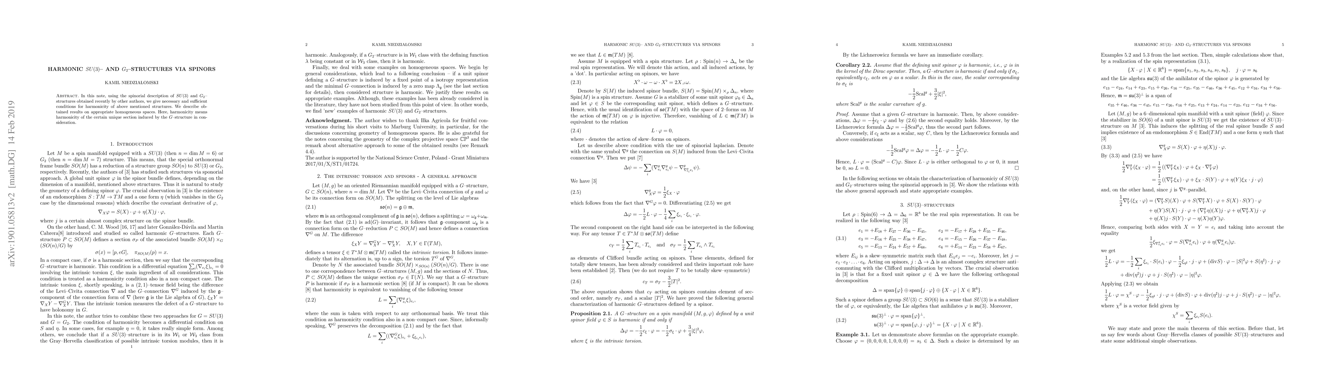 In this note, using the spinorial description of $SU(3)$ and $G_2$-structures obtained recently by other authors, we give necessary and sufficient conditions for harmonicity of above mentioned structures. We describe obtained results on appropriate homogeneous spaces. Here, harmonicity means harmonicity of the unique section induced by a $G$-structure in consideration.