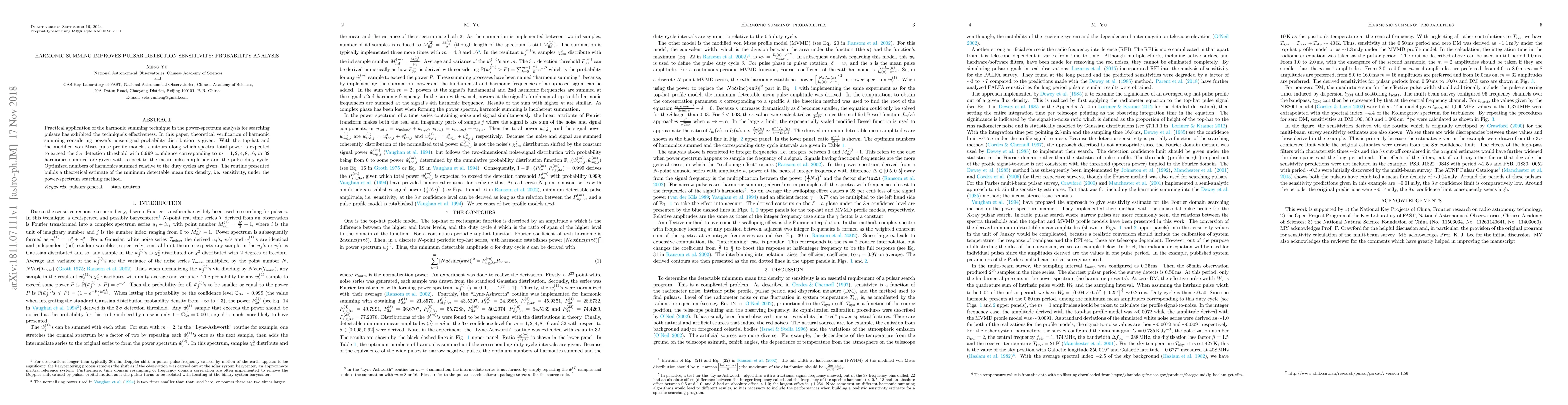 Researchers developed a new method to improve pulsar detection sensitivity using harmonic summing, finding that certain harmonics summed relative to duty cycles can achieve 0.999 confidence in detecting signals, leading to improved sensitivity.