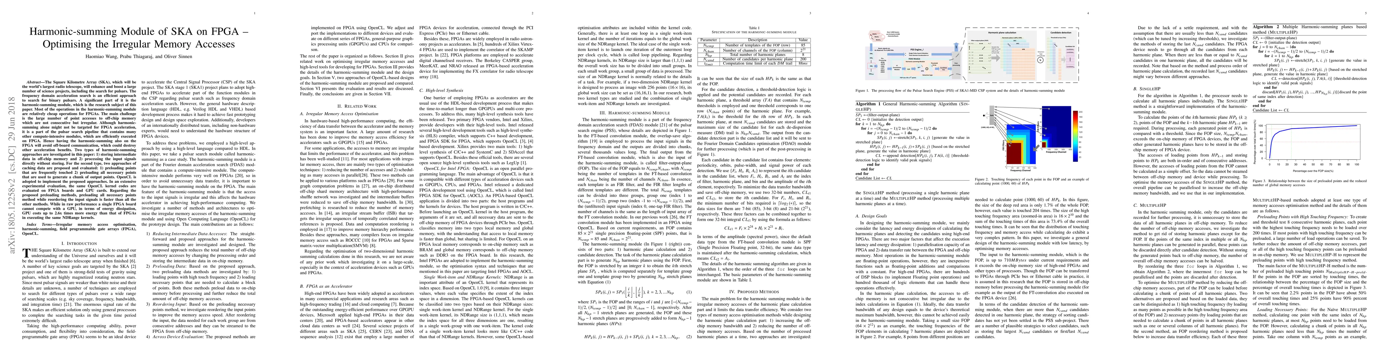 The Square Kilometre Array (SKA), which will be the world's largest radio telescope, will enhance and boost a large number of science projects, including the search for pulsars. The frequency domain acceleration search is an efficient approach to search for binary pulsars. A significant part of it is the harmonic-summing module, which is the research subject of this paper. Most of the operations in the harmonic-summing module are relatively cheap operations for FPGAs. The main challenge is the large number of point accesses to off-chip memory which are not consecutive but irregular. Although harmonic-summing alone might not be targeted for FPGA acceleration, it is a part of the pulsar search pipeline that contains many other compute-intensive modules, which are efficiently executed on FPGA. Hence having the harmonic-summing also on the FPGA will avoid off-board communication, which could destroy other acceleration benefits. Two types of harmonic-summing approaches are investigated in this paper: 1) storing intermediate data in off-chip memory and 2) processing the input signals directly without storing. For the second type, two approaches of caching data are proposed and evaluated: 1) preloading points that are frequently touched 2) preloading all necessary points that are used to generate a chunk of output points. OpenCL is adopted to implement the proposed approaches. In an extensive experimental evaluation, the same OpenCL kernel codes are evaluated on FPGA boards and GPU cards. Regarding the proposed preloading methods, preloading all necessary points method while reordering the input signals is faster than all the other methods. While in raw performance a single FPGA board cannot compete with a GPU, in terms of energy dissipation, GPU costs up to 2.6x times more energy than that of FPGAs in executing the same NDRange kernels.