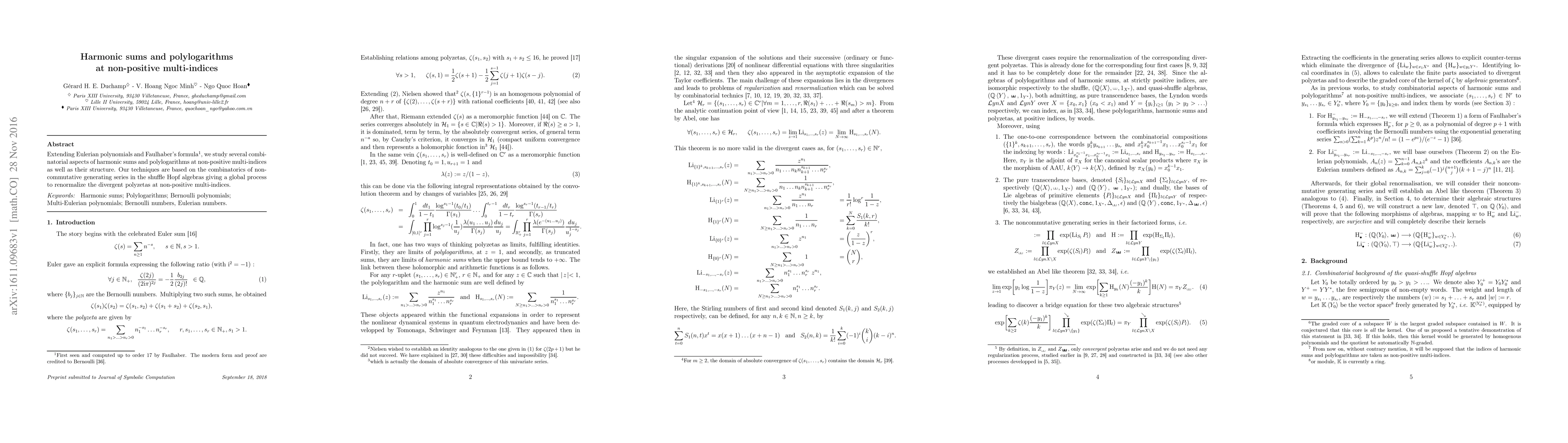 Extending Eulerian polynomials and Faulhaber's formula 1, we study several combi-natorial aspects of harmonic sums and polylogarithms at non-positive multi-indices as well as their structure. Our techniques are based on the combinatorics of non-commutative generating series in the shuffle Hopf algebras giving a global process to renormalize the divergent polyzetas at non-positive multi-indices.