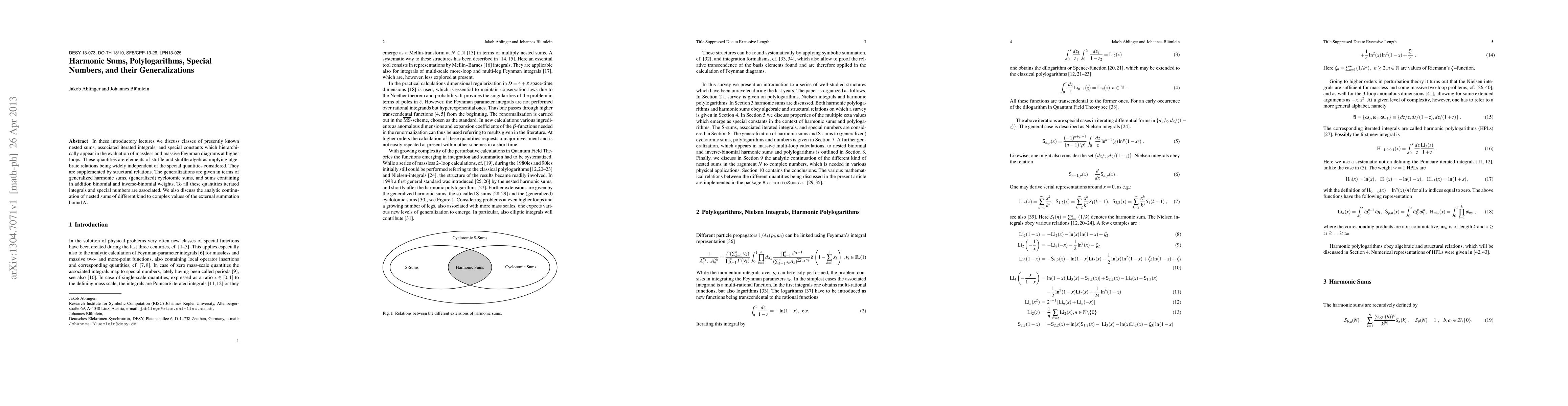 This paper introduces nested sums, iterated integrals, and special constants relevant to evaluating Feynman diagrams, focusing on stuffle and shuffle algebras and their algebraic relations. It generalizes these concepts to harmonic, cyclotomic, and binomial sums, while discussing their analytic continuation to complex values.