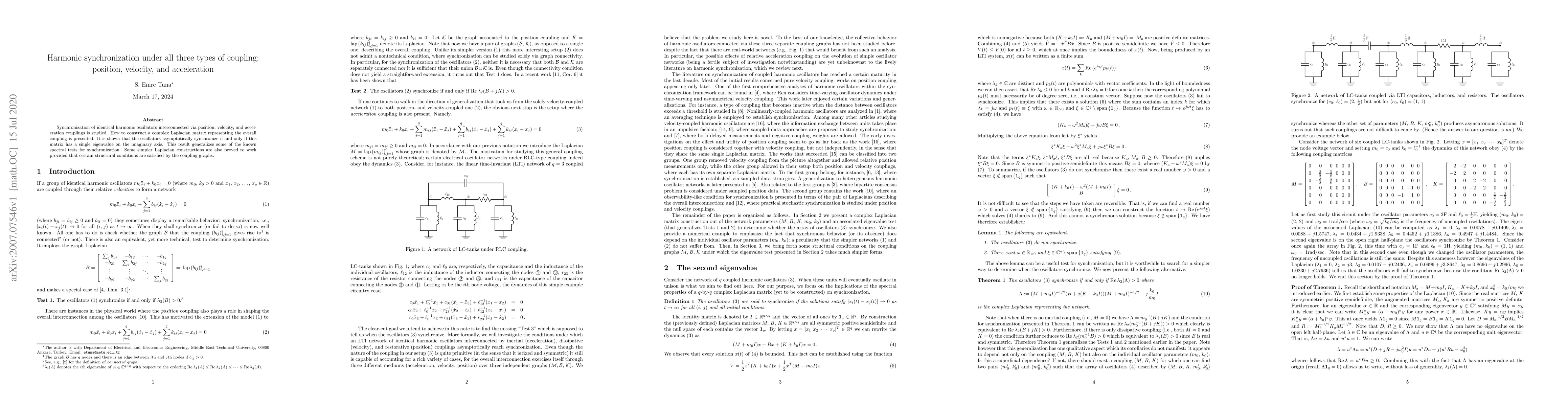 Synchronization of identical harmonic oscillators interconnected via position, velocity, and acceleration couplings is studied. How to construct a complex Laplacian matrix representing the overall coupling is presented. It is shown that the oscillators asymptotically synchronize if and only if this matrix has a single eigenvalue on the imaginary axis. This result generalizes some of the known spectral tests for synchronization. Some simpler Laplacian constructions are also proved to work provided that certain structural conditions are satisfied by the coupling graphs.