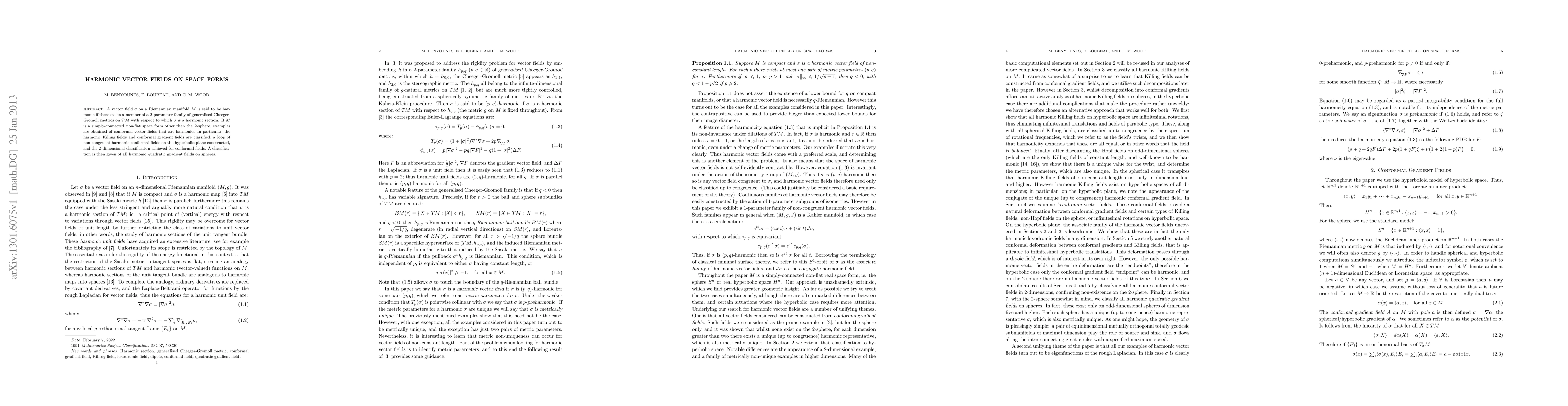The paper explores harmonic vector fields on various space forms, particularly focusing on conformal and Killing fields. It classifies harmonic Killing and conformal gradient fields, constructs a loop of non-congruent harmonic conformal fields on the hyperbolic plane, and achieves a 2-dimensional classification for conformal fields, alongside a comprehensive classification of harmonic quadratic gradient fields on spheres.