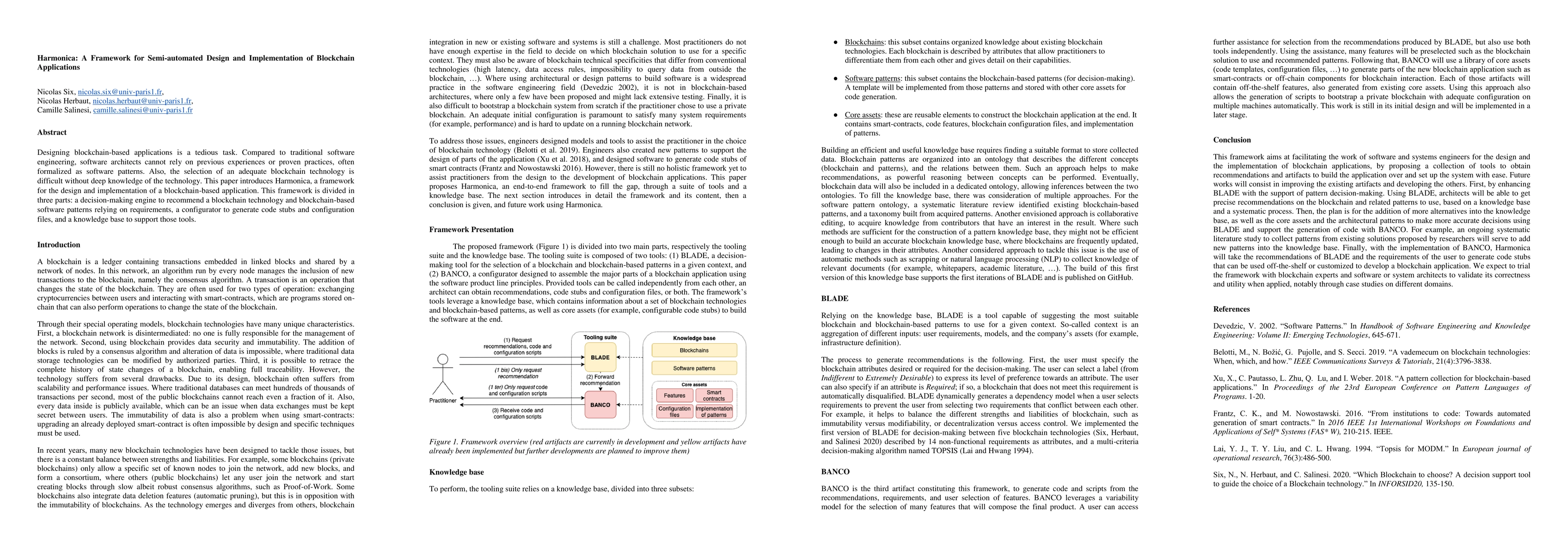 Harmonica is a framework that simplifies designing and implementing blockchain applications by providing a decision-making engine, configurator, and knowledge base to recommend blockchain technologies and software patterns.