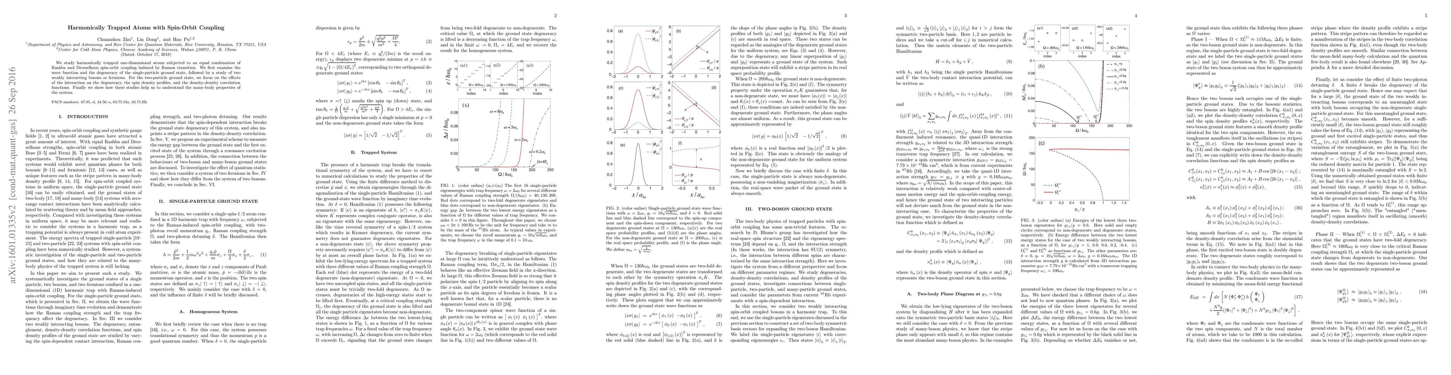 We study harmonically trapped one-dimensional atoms subjected to an equal combination of Rashba and Dresselhaus spin-orbit coupling induced by Raman transition. We first examine the wave function and the degeneracy of the single-particle ground state, followed by a study of two weakly interacting bosons or fermions. For the two-particle ground state, we focus on the effects of the interaction on the degeneracy, the spin density profiles, and the density-density correlation functions. Finally we show how these studies help us to understand the many-body properties of the system.