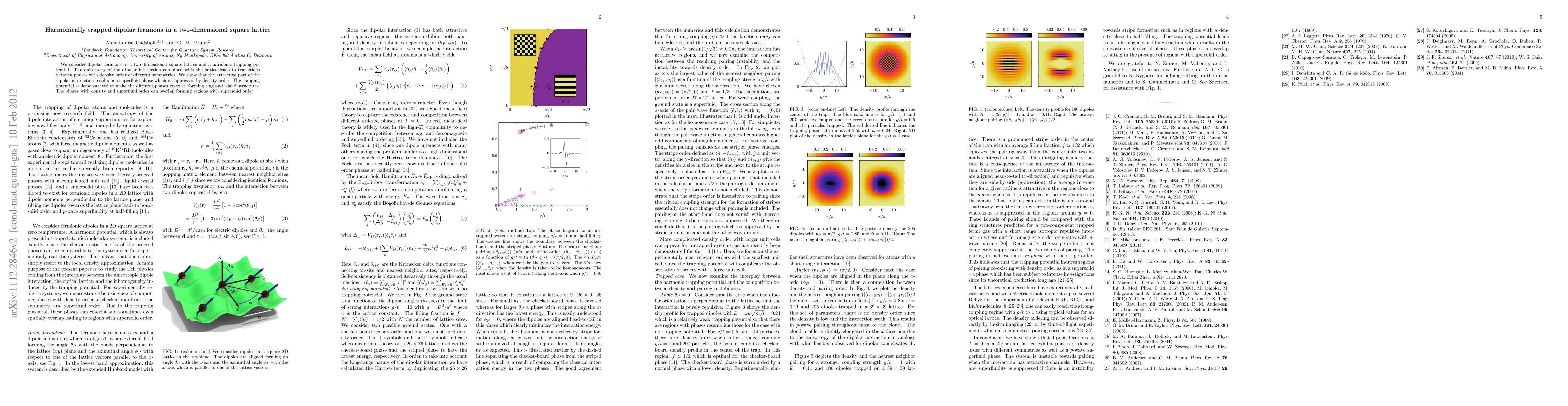 Summary: This study explores dipolar fermions in a two-dimensional square lattice under harmonic trapping, revealing phase transitions driven by anisotropic dipolar interactions. The attractive component induces a superfluid phase, which coexists with density-ordered phases, forming complex structures like rings and islands.