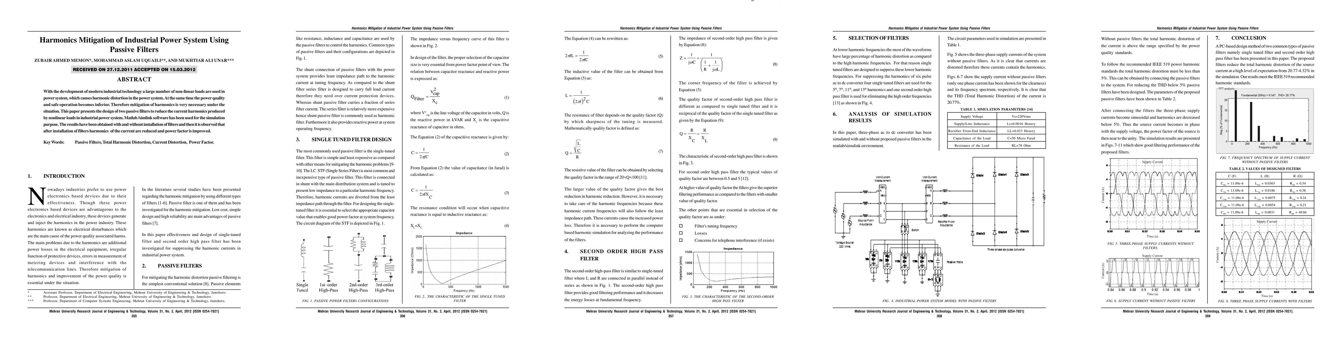 This paper designs two passive filters to mitigate harmonic distortion in industrial power systems caused by non-linear loads. Simulation results using Matlab/Simulink show that the filters effectively reduce current harmonics and improve power factor.