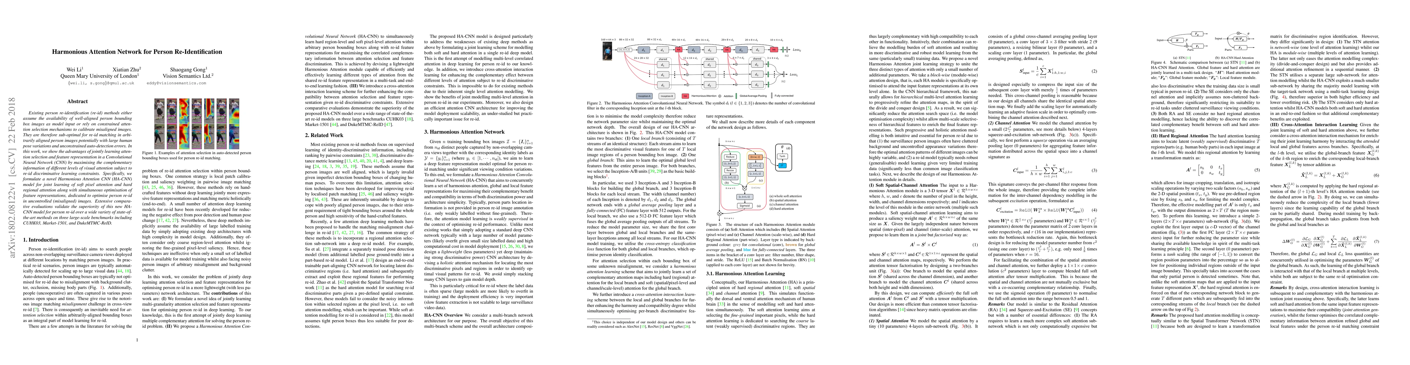 The paper proposes a Harmonious Attention Network (HA-CNN) for person re-identification, which jointly learns attention selection and feature representation to optimize performance in arbitrarily aligned images. The model outperforms existing methods on multiple benchmarks by leveraging both soft pixel and hard regional attention.