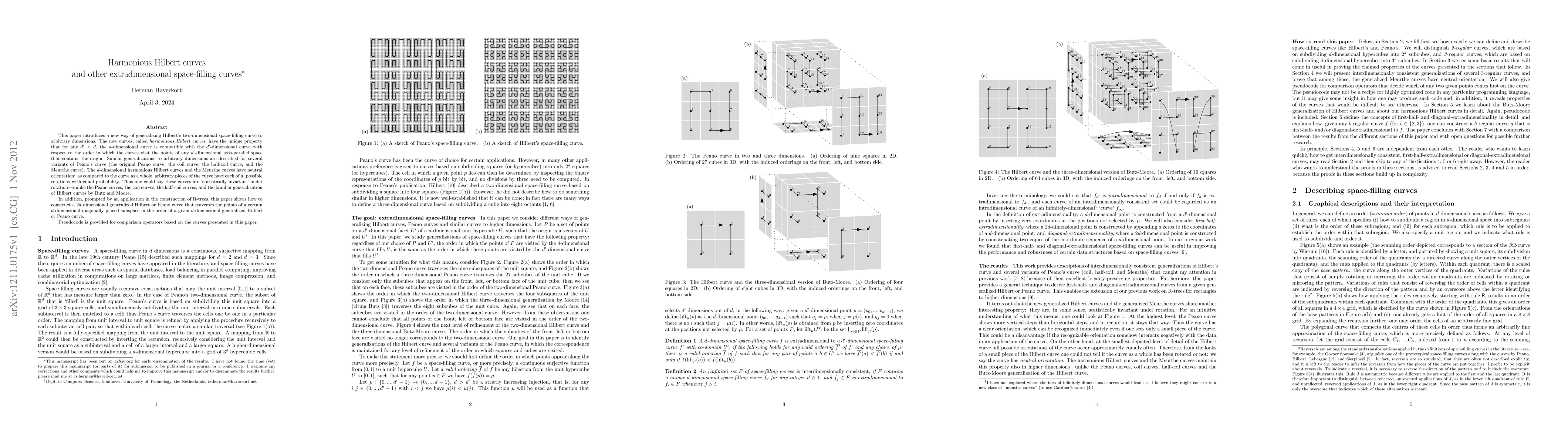 This paper generalizes Hilbert's space-filling curve to arbitrary dimensions, introducing harmonious Hilbert curves that maintain order compatibility across dimensions. It also extends similar properties to variants of Peano's curve, highlighting statistical invariance under rotation for certain curves, and provides construction methods for generalized curves in diagonally placed subspaces.