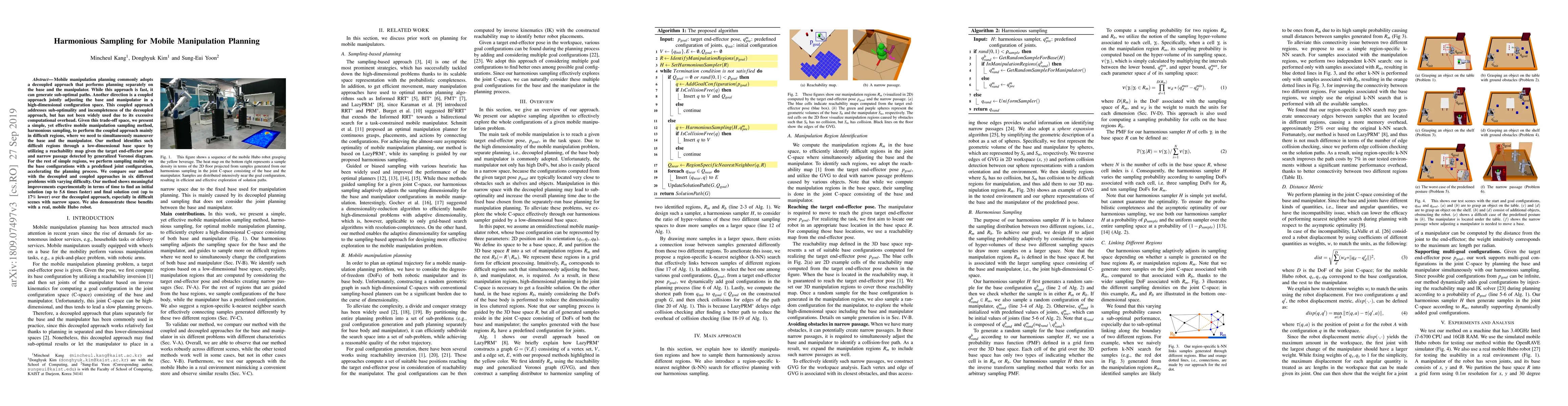 This paper proposes harmonious sampling for mobile manipulation planning, which selectively applies a coupled approach in difficult regions identified via a reachability map and generalized Voronoi diagram, while using a decoupled approach in simpler regions to speed up planning. Experimentally, it shows up to 5.6 times faster initial solutions and up to 17% lower final solution costs compared to the decoupled approach.