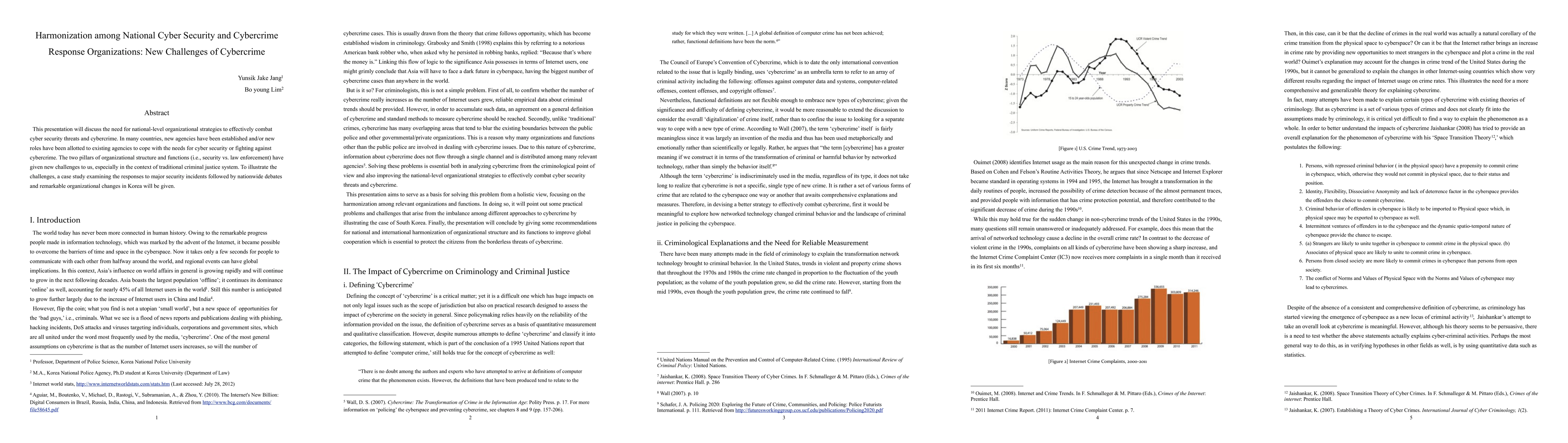 This paper will discuss the need for national-level organizational strategies to effectively combat cyber security threats and cybercrime. In many countries, new agencies have been established and/or new roles have been allotted to existing agencies to cope with the needs for cyber security or fighting against cybercrime. The two pillars of organizational structure and functions (i.e., security vs. law enforcement) have given new challenges to us, especially in the context of traditional criminal justice system. To illustrate the challenges, a case study examining the responses to major security incidents followed by nationwide debates and remarkable organizational changes in Korea will be given.