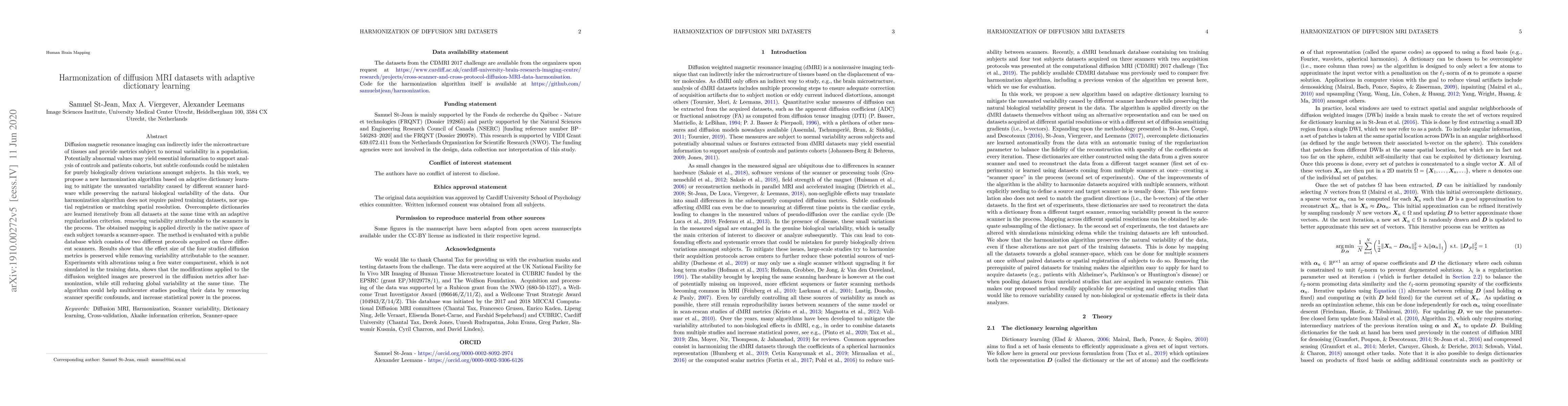 This paper proposes a novel harmonization algorithm based on adaptive dictionary learning to mitigate scanner-induced variability in diffusion MRI datasets, preserving biological variability. The method uses overcomplete dictionaries learned from the data to reconstruct and harmonize data from different scanners, demonstrated to effectively remove scanner-specific confounds while maintaining the effect size of diffusion metrics.