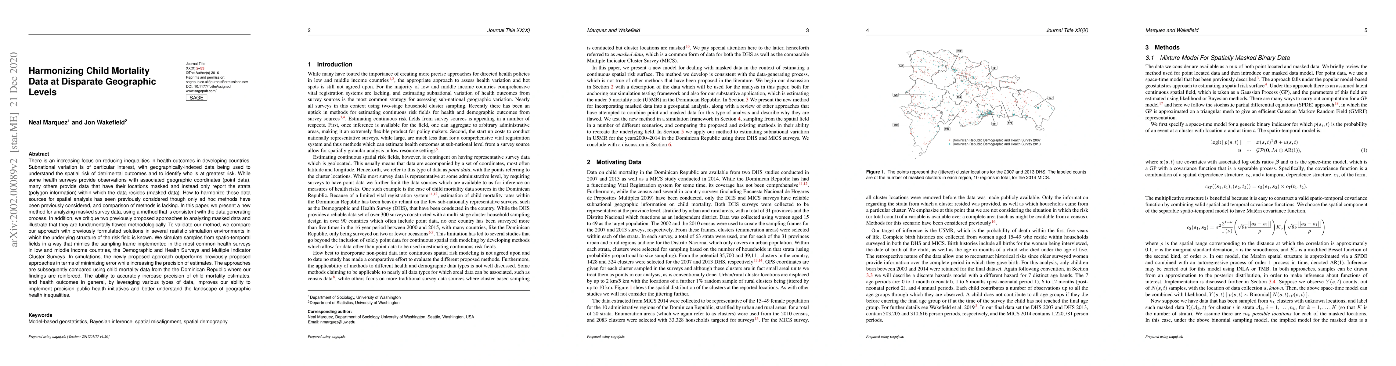 There is an increasing focus on reducing inequalities in health outcomes in developing countries. Subnational variation is of particular interest, with geographic data used to understand the spatial risk of detrimental outcomes and to identify who is at greatest risk. While some health surveys provide observations with associated geographic coordinates, many others provide data that have their locations masked and instead only report the strata within which the data resides. How to harmonize these data sources for spatial analysis has seen previously considered though no method has been agreed upon and comparison of the validity of methods are lacking. In this paper, we present a new method for analyzing masked survey data alongside traditional geolocated data, using a method that is consistent with the data generating process. In addition, we critique two proposed approaches to analyzing masked data and illustrate that they are fundamentally flawed methodologically. To validate our method, we compare our approach with previously formulated solutions in several realistic simulation environments in which the underlying structure of the risk field is known. We simulate samples from spatial fields in a way that mimics the sampling frame implemented in the most common health surveys in low and middle income countries, the DHS and MICS. In simulations, the newly proposed approach outperforms previously proposed approaches in terms of minimizing error while increasing the precision of estimates. The approaches are subsequently compared using child mortality data from the Dominican Republic where our findings are reinforced. Accurately increasing precision of child mortality estimates, and health estimates in general, by leveraging various types of data improves our ability to implement precision public health initiatives and better understand the landscape of geographic health inequalities.