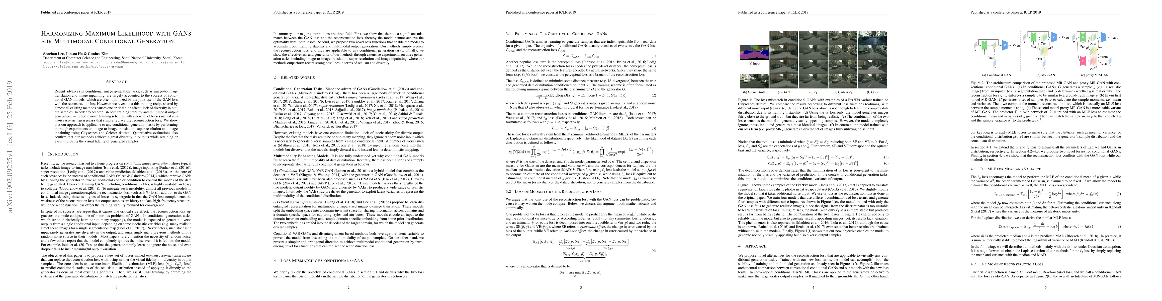 Recent advances in conditional image generation tasks, such as image-to-image translation and image inpainting, are largely accounted to the success of conditional GAN models, which are often optimized by the joint use of the GAN loss with the reconstruction loss. However, we reveal that this training recipe shared by almost all existing methods causes one critical side effect: lack of diversity in output samples. In order to accomplish both training stability and multimodal output generation, we propose novel training schemes with a new set of losses named moment reconstruction losses that simply replace the reconstruction loss. We show that our approach is applicable to any conditional generation tasks by performing thorough experiments on image-to-image translation, super-resolution and image inpainting using Cityscapes and CelebA dataset. Quantitative evaluations also confirm that our methods achieve a great diversity in outputs while retaining or even improving the visual fidelity of generated samples.