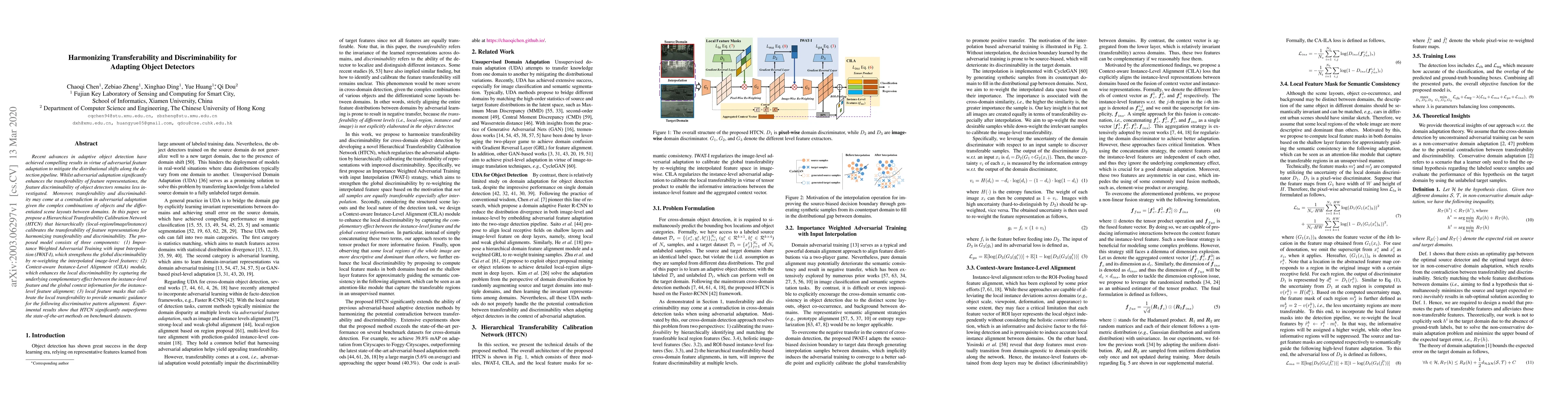 This paper proposes a Hierarchical Transferability Calibration Network (HTCN) to balance transferability and discriminability in adaptive object detectors, addressing the contradiction between these two aspects in adversarial adaptation. The HTCN includes three components: IWAT-I for global discriminability, CILA for local discriminability, and local feature masks for local transferability calibration, achieving superior performance on benchmark datasets.