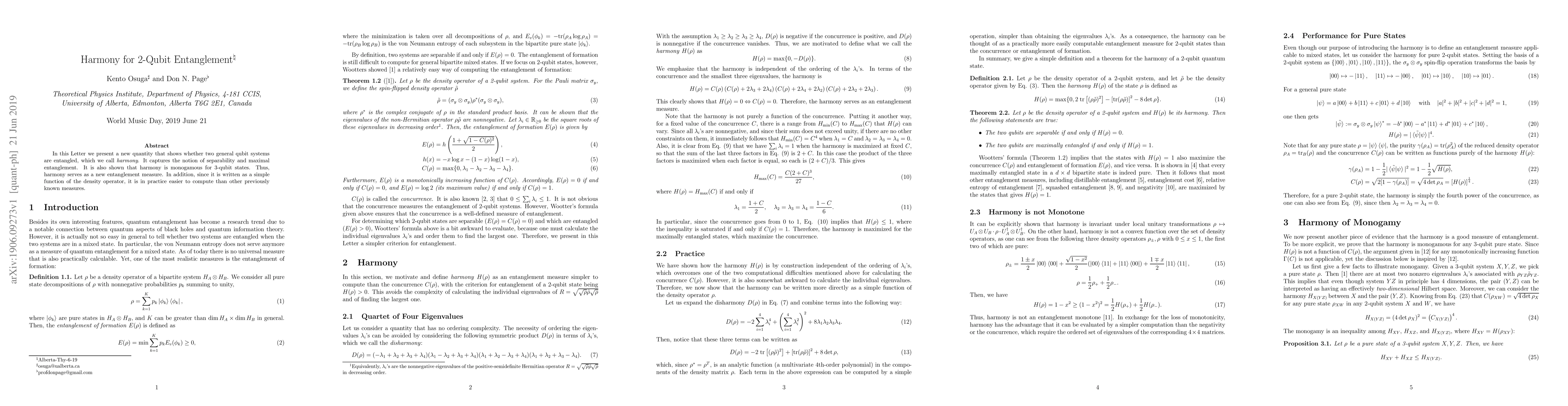 This paper introduces "harmony," a new measure for determining 2-qubit entanglement, which effectively captures separability and maximal entanglement, and is computationally simpler than existing measures. Additionally, harmony demonstrates monogamous properties for 3-qubit states.