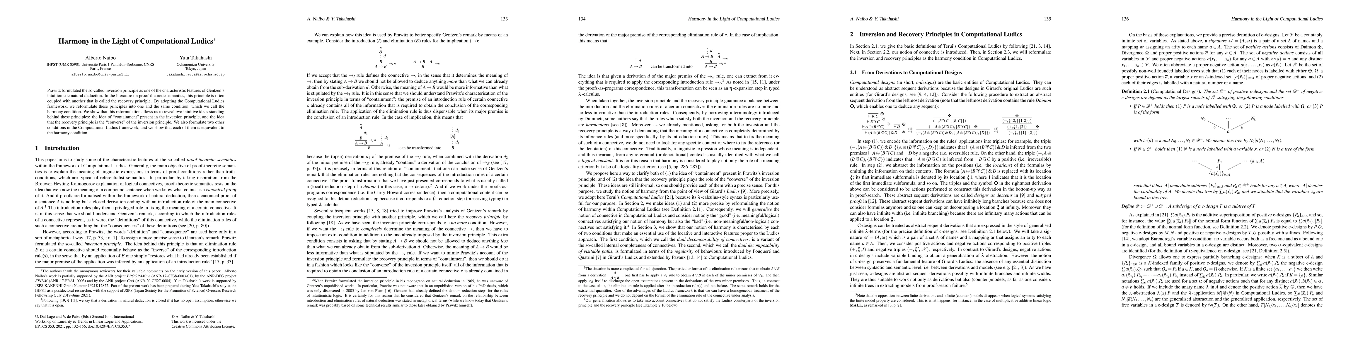 Prawitz formulated the so-called inversion principle as one of the characteristic features of Gentzen's intuitionistic natural deduction. In the literature on proof-theoretic semantics, this principle is often coupled with another that is called the recovery principle. By adopting the Computational Ludics framework, we reformulate these principles into one and the same condition, which we call the harmony condition. We show that this reformulation allows us to reveal two intuitive ideas standing behind these principles: the idea of "containment" present in the inversion principle, and the idea that the recovery principle is the "converse" of the inversion principle. We also formulate two other conditions in the Computational Ludics framework, and we show that each of them is equivalent to the harmony condition.