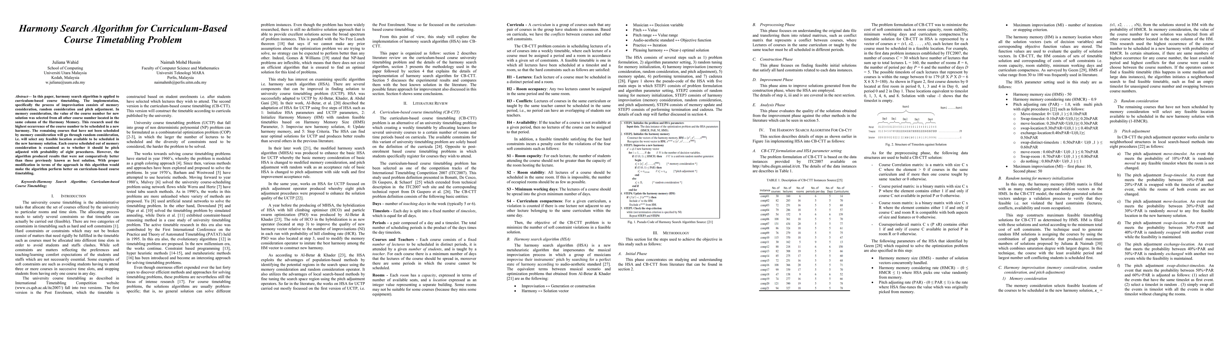 This paper applies the harmony search algorithm to solve the curriculum-based course timetabling problem, incorporating memory consideration, random selection, and pitch adjustment. However, the algorithm did not outperform existing solutions, suggesting potential for improvement with modifications.