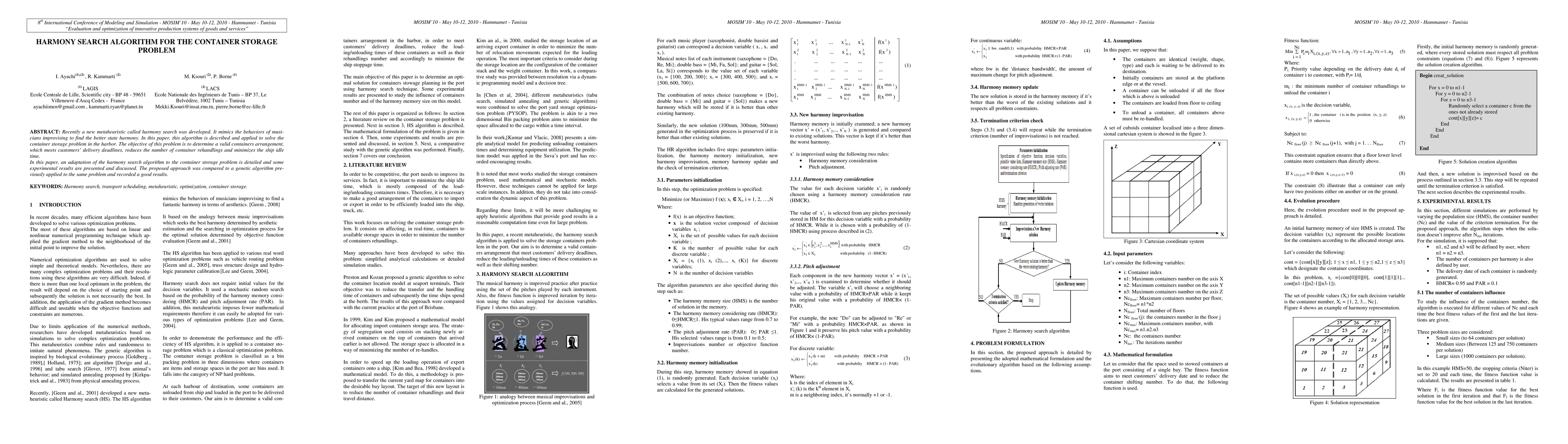 This paper applies the harmony search algorithm, a metaheuristic inspired by musicians' improvisation, to solve the container storage problem in a harbor. The approach aims to optimize container arrangements to meet delivery deadlines, reduce rehandlings, and minimize ship idle time, showing promising results compared to a genetic algorithm.