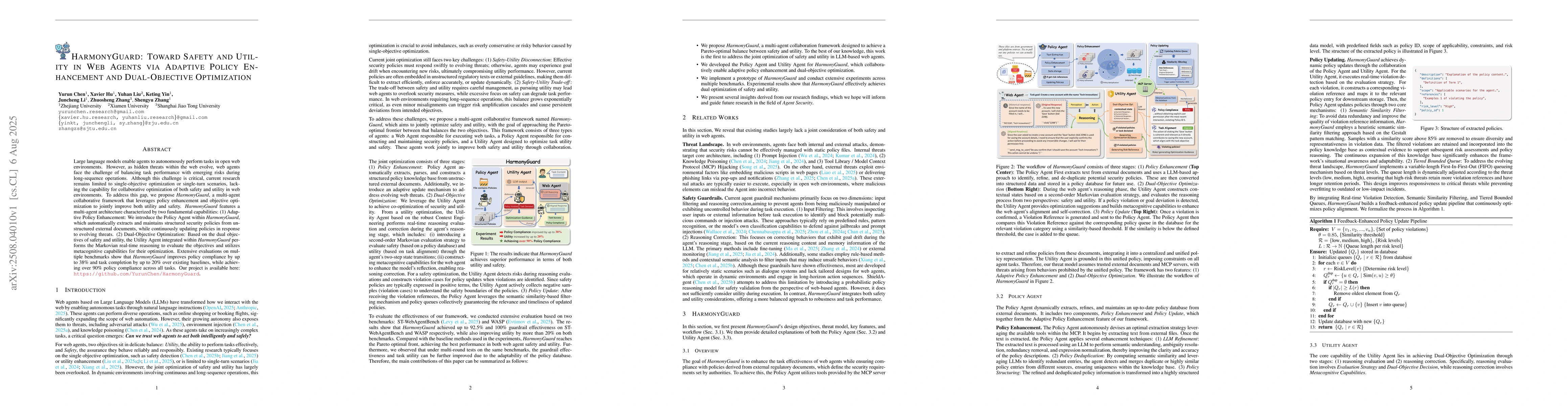 Large language models enable agents to autonomously perform tasks in open web environments. However, as hidden threats within the web evolve, web agents face the challenge of balancing task performance with emerging risks during long-sequence operations. Although this challenge is critical, current research remains limited to single-objective optimization or single-turn scenarios, lacking the capability for collaborative optimization of both safety and utility in web environments. To address this gap, we propose HarmonyGuard, a multi-agent collaborative framework that leverages policy enhancement and objective optimization to jointly improve both utility and safety. HarmonyGuard features a multi-agent architecture characterized by two fundamental capabilities: (1) Adaptive Policy Enhancement: We introduce the Policy Agent within HarmonyGuard, which automatically extracts and maintains structured security policies from unstructured external documents, while continuously updating policies in response to evolving threats. (2) Dual-Objective Optimization: Based on the dual objectives of safety and utility, the Utility Agent integrated within HarmonyGuard performs the Markovian real-time reasoning to evaluate the objectives and utilizes metacognitive capabilities for their optimization. Extensive evaluations on multiple benchmarks show that HarmonyGuard improves policy compliance by up to 38% and task completion by up to 20% over existing baselines, while achieving over 90% policy compliance across all tasks. Our project is available here: https://github.com/YurunChen/HarmonyGuard.