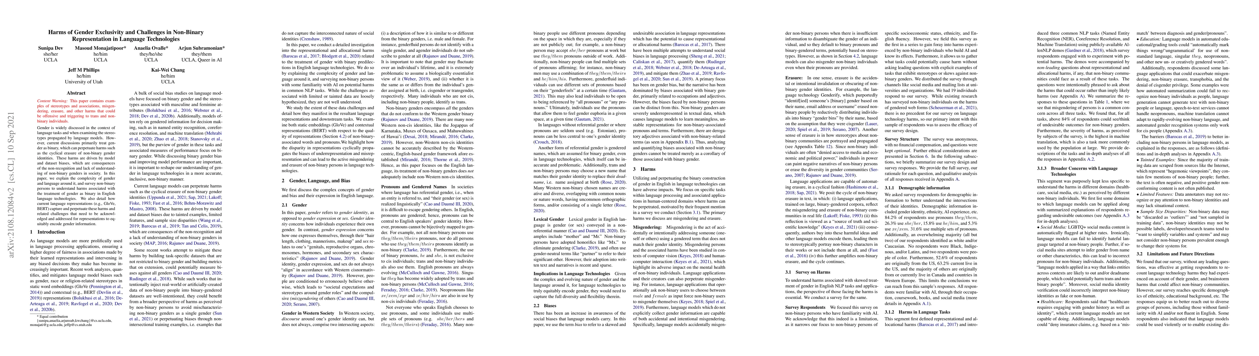 This paper examines the harms of treating gender as binary in language technologies, highlighting the erasure of non-binary identities and biases in models and datasets. It surveys non-binary individuals to understand these harms and discusses how current language representations perpetuate them, calling for more equitable gender encoding.