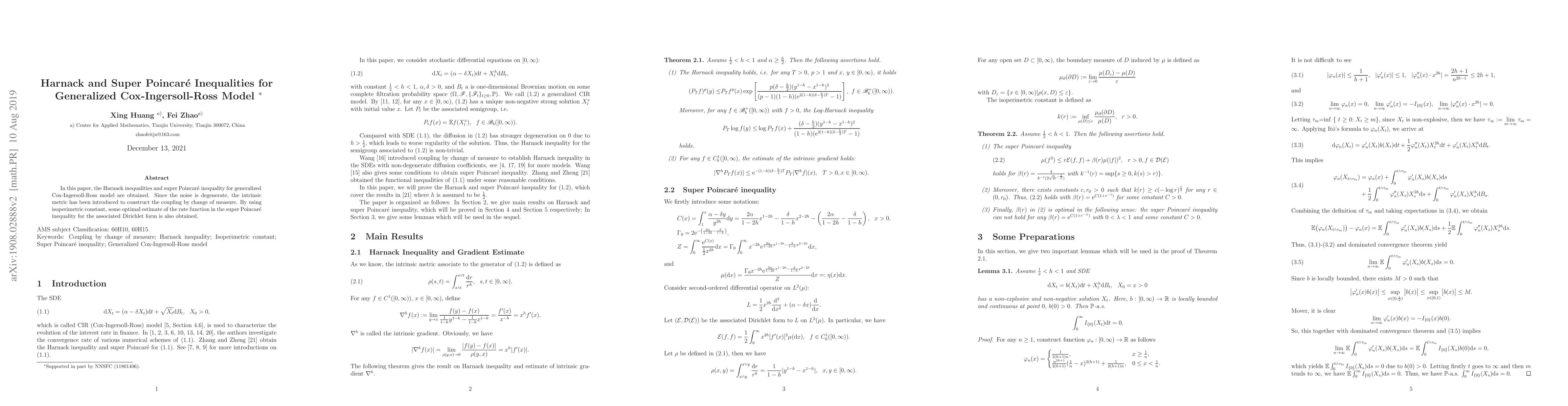 In this paper, the Harnack inequalities and super-Poincar\'{e} inequality for generalized CIR model are obtained. Since the noise is degenerate, the intrinsic metric has been introduced to construct the coupling by change of measure. By using isopermetric constant, the optimal estimate of the rate function in the super Poincar\'{e} inequality for the associated Dirichlet form is also obtained.