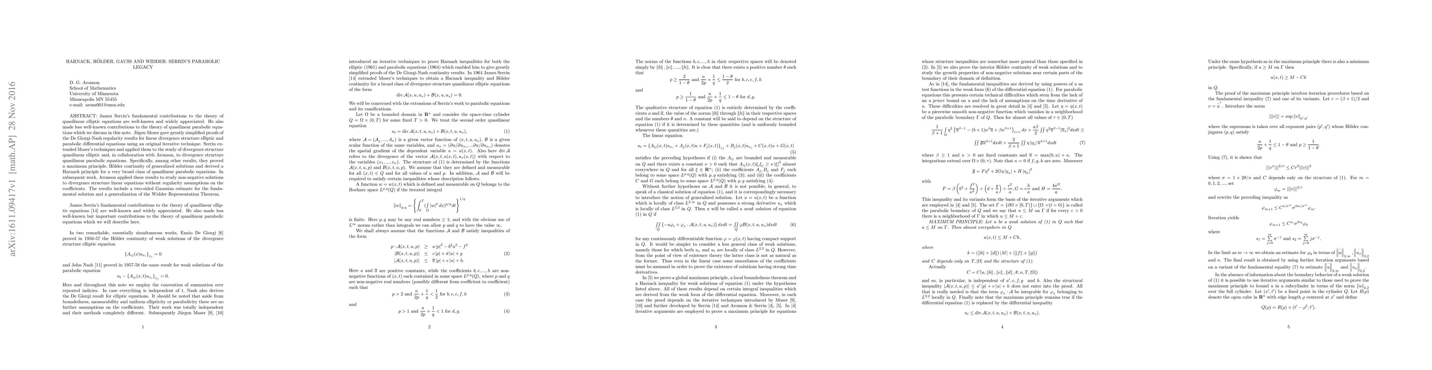 James Serrin's fundamental contributions to the theory of quasilinear elliptic equations are well-known and widely appreciated. He also made less well-known contributions to the theory of quasilinear parabolic equations which we dicuss in this note. Jurgen Moser gave greatly simplified proofs of the De Giorgi-Nash regularity results for linear divergence structure elliptic and parabolic differential equations using an original iterative technique. Serrin extended Moser's techniques and applied them to the study of divergence structure quasilinear elliptic equations, and in collaboration with Aronson, to divergence structure quasilinear parabolic equations. Specifically, among other results, they proved a maximum principle, Holder continuity of generalized solutions and derived a Harnack principle for a very broad class of quasilinear parabolic equations. In subsequent work, Aronson applied these results to study non-negative solutions to divergence structure linear equations without regularity assumptions on the coefficients. The results include a two-sided Gaussian estimate for the fundamental solution and a generalization of the Widder Representation Theorem.