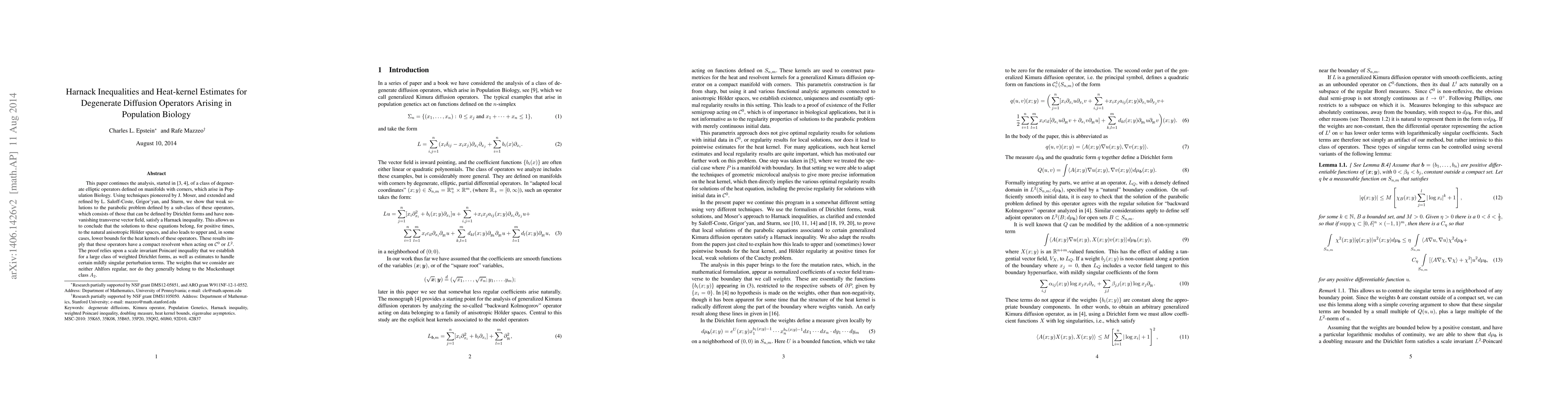 This paper continues the analysis, started in [2, 3], of a class of degenerate elliptic operators defined on manifolds with corners, which arise in Population Biology. Using techniques pioneered by J. Moser, and extended and refined by L. Saloff-Coste, Grigoryan, and Sturm, we show that weak solutions to the parabolic problem defined by a sub-class of these operators, which consists of those that can be defined by Dirichlet forms and have non-vanishing transverse vector field, satisfy a Harnack inequality. This allows us to conclude that the solutions to these equations belong, for positive times, to the natural anisotropic Holder spaces, and also leads to upper and, in some cases, lower bounds for the heat kernels of these operators. These results imply that these operators have a compact resolvent when acting on $C^0$ or $L^2.$ The proof relies upon a scale invariant Poincare inequality that we establish for a large class of weighted Dirichlet forms, as well as estimates to handle certain mildly singular perturbation terms. The weights that we consider are neither Ahlfors regular, nor do they generally belong to the Muckenhaupt class $A_2.$