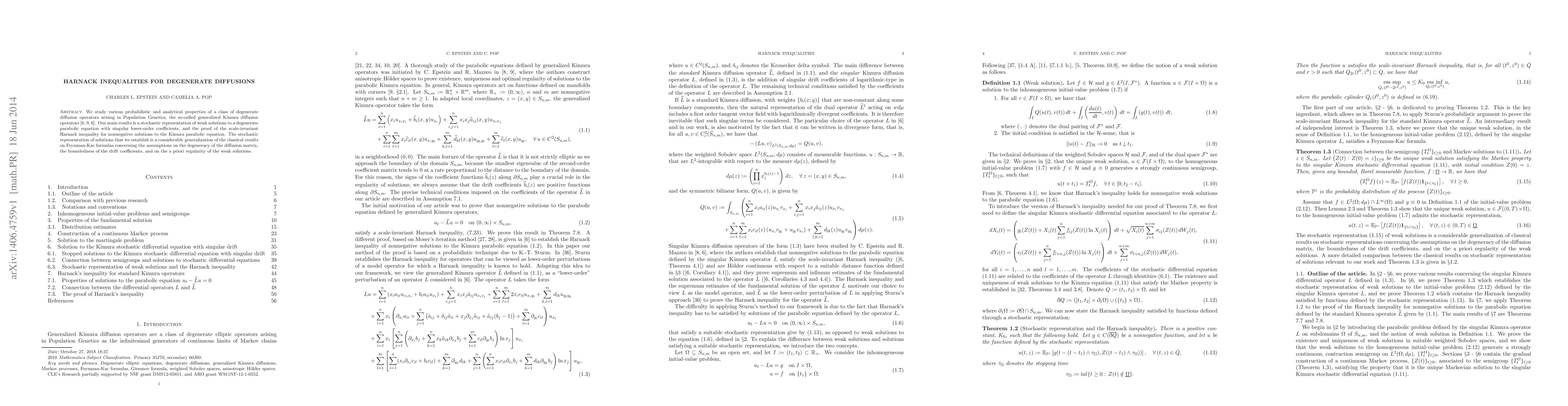 We study various probabilistic and analytical properties of a class of degenerate diffusion operators arising in Population Genetics, the so-called generalized Kimura diffusion operators. Our main results is a stochastic representation of weak solutions to a degenerate parabolic equation with singular lower-order coefficients, and the proof of the scale-invariant Harnack inequality for nonnegative solutions to the Kimura parabolic equation. The stochastic representation of solutions that we establish is a considerable generalization of the classical results on Feynman-Kac formulas concerning the assumptions on the degeneracy of the diffusion matrix, the boundedness of the drift coefficients, and on the a priori regularity of the weak solutions.