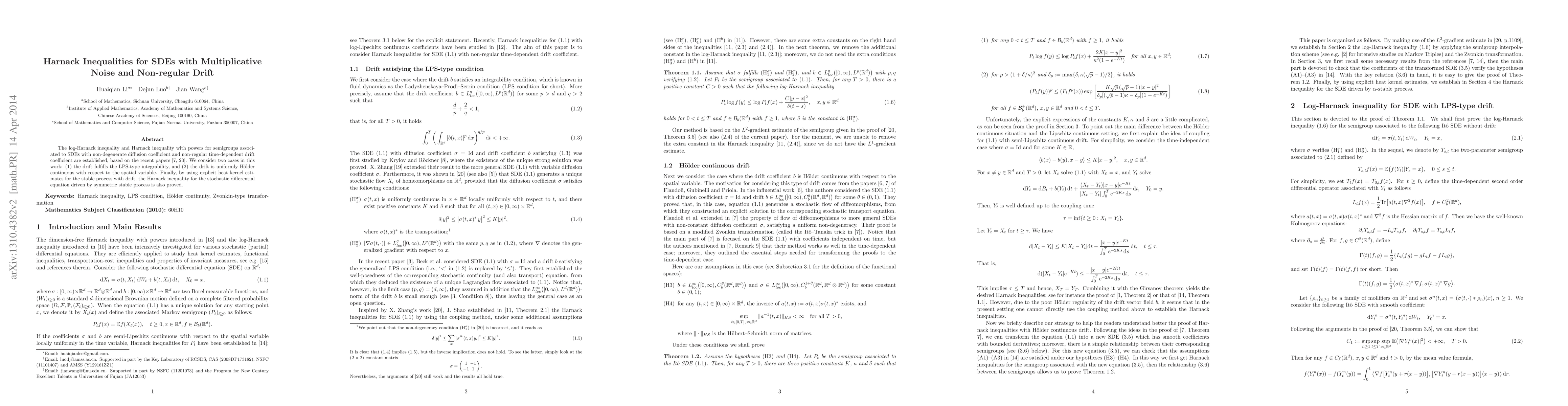 This paper establishes Harnack inequalities for SDEs with multiplicative noise and non-regular drift, considering two drift cases: LPS-type integrability and uniform Hölder continuity. It also proves the Harnack inequality for SDEs driven by symmetric stable processes using heat kernel estimates.