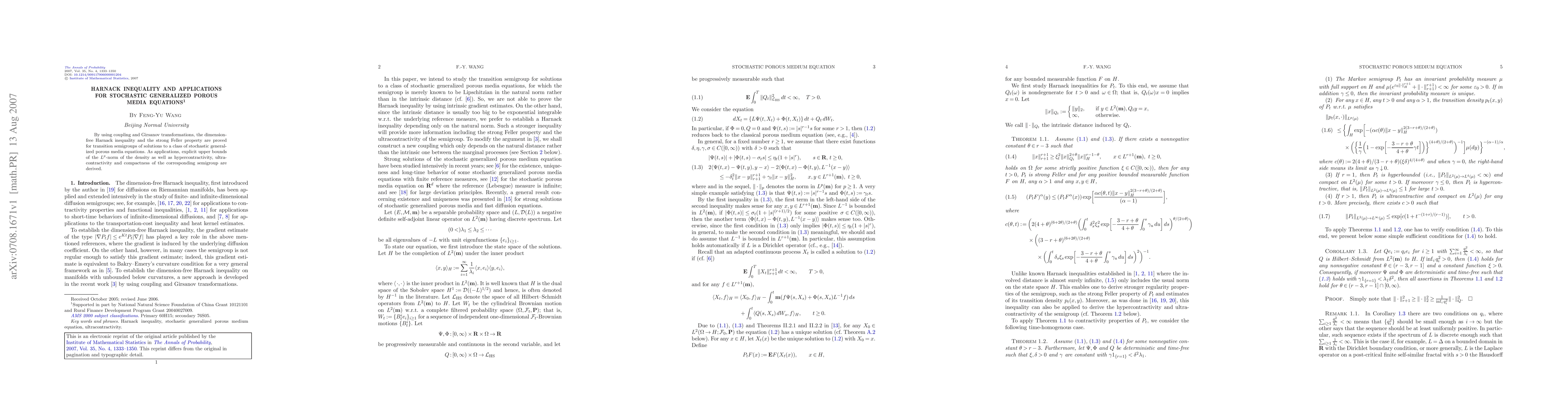 By using coupling and Girsanov transformations, the dimension-free Harnack inequality and the strong Feller property are proved for transition semigroups of solutions to a class of stochastic generalized porous media equations. As applications, explicit upper bounds of the $L^p$-norm of the density as well as hypercontractivity, ultracontractivity and compactness of the corresponding semigroup are derived.