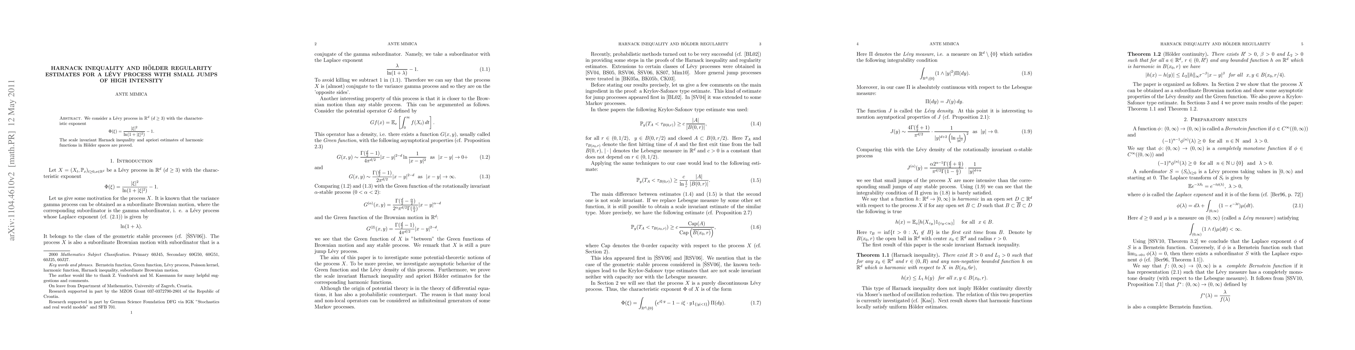 We consider a L\' evy process in $\R^d$ $ (d\geq 3)$ with the characteristic exponent \[ \Phi(\xi)=\frac{|\xi|^2}{\ln(1+|\xi|^2)}-1. \] The scale invariant Harnack inequality and apriori estimates of harmonic functions in H\" older spaces are proved.