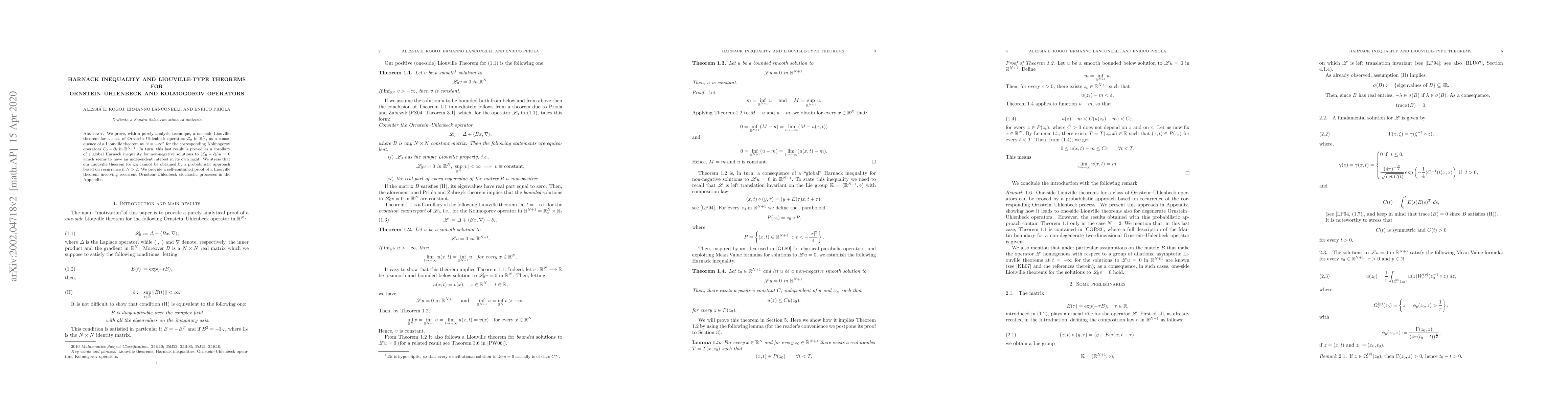 The paper proves a one-side Liouville theorem for Ornstein-Uhlenbeck operators in R^N, leveraging a global Harnack inequality and a Kolmogorov operator theorem.