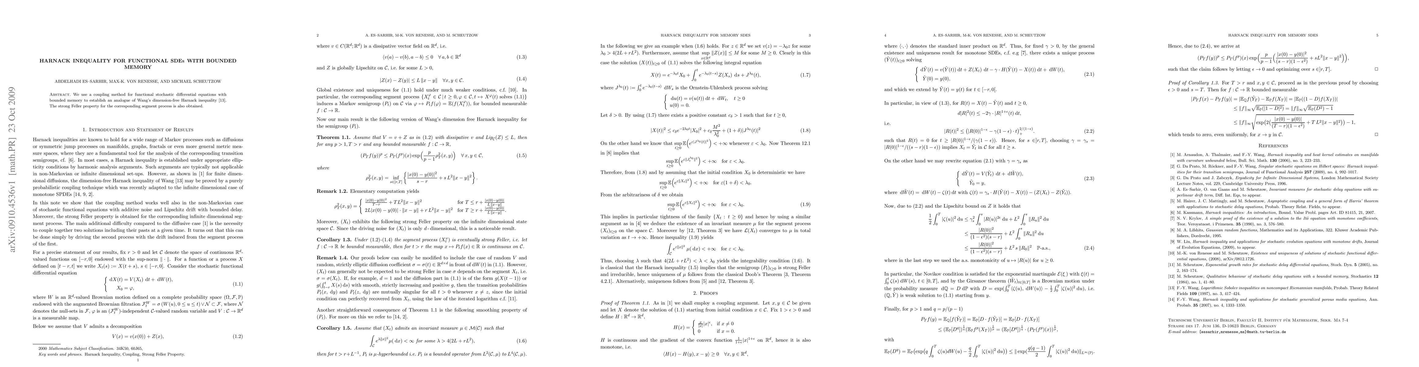 Researchers establish an analogue of Wang's Harnack inequality for functional SDEs with bounded memory using a coupling method, demonstrating strong Feller property for the corresponding segment process.