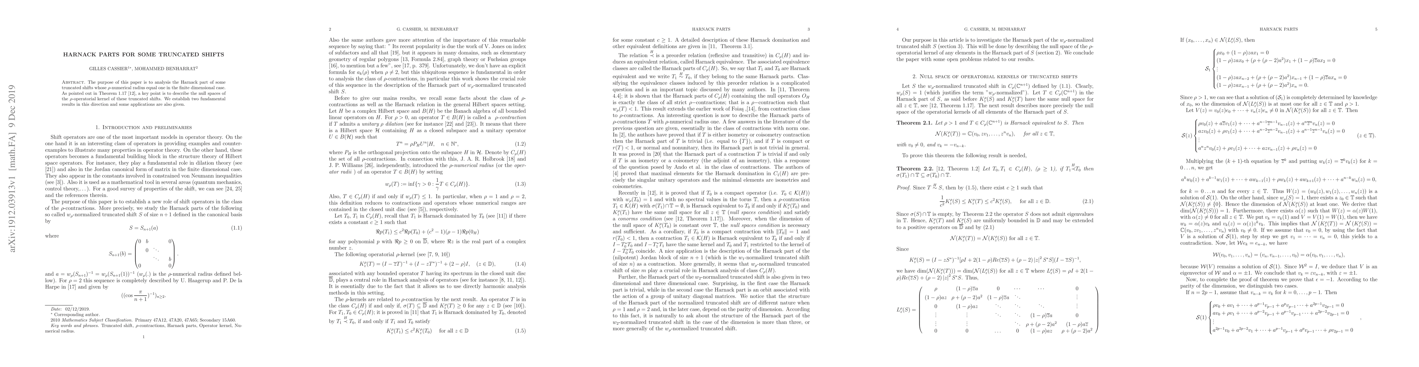 The purpose of this paper is to analysis the Harnack part of some truncated shifts whose $\rho$-numerical radius equal one in the finite dimensional case. As pointed out in Theorem 1.17 [12], a key point is to describe the null spaces of the $\rho$-operatorial kernel of these truncated shifts. We establish two fundamental results in this direction and some applications are also given.