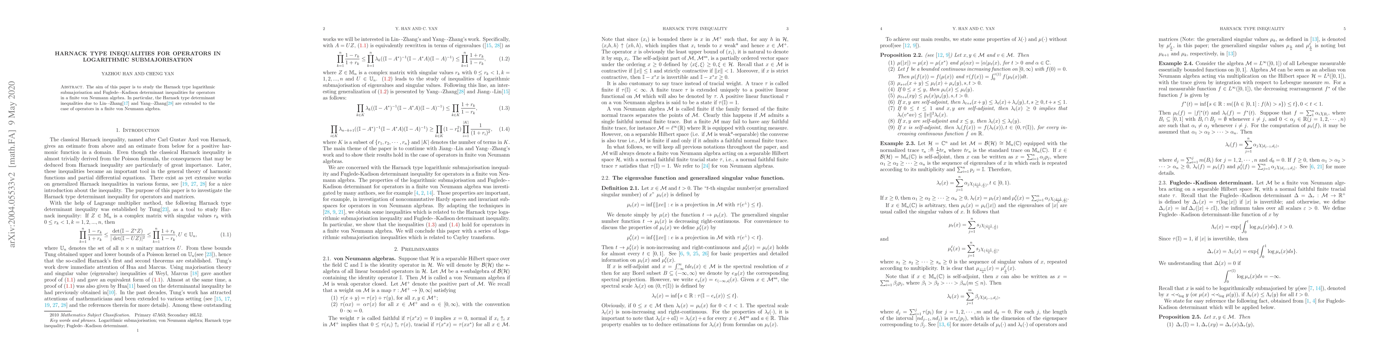 The aim of this paper is to study the Harnack type logarithmic submajorisation and Fuglede-Kadison determinant inequalities for operators in a finite von Neumann algebra. In particular, the Harnack type determinant inequalities due to Lin-Zhang [15] and Yang-Zhang [27] are extended to the case of operators in a finite von Neumann algebra.