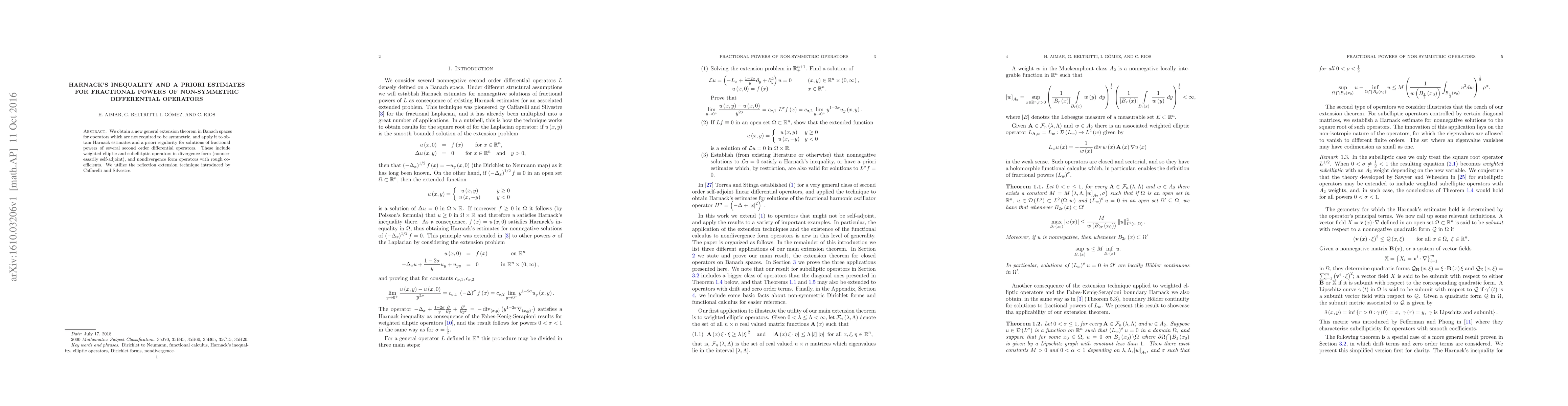 This paper extends Harnack's inequality to non-symmetric differential operators, providing a priori estimates for solutions of fractional powers of various second-order differential operators.
