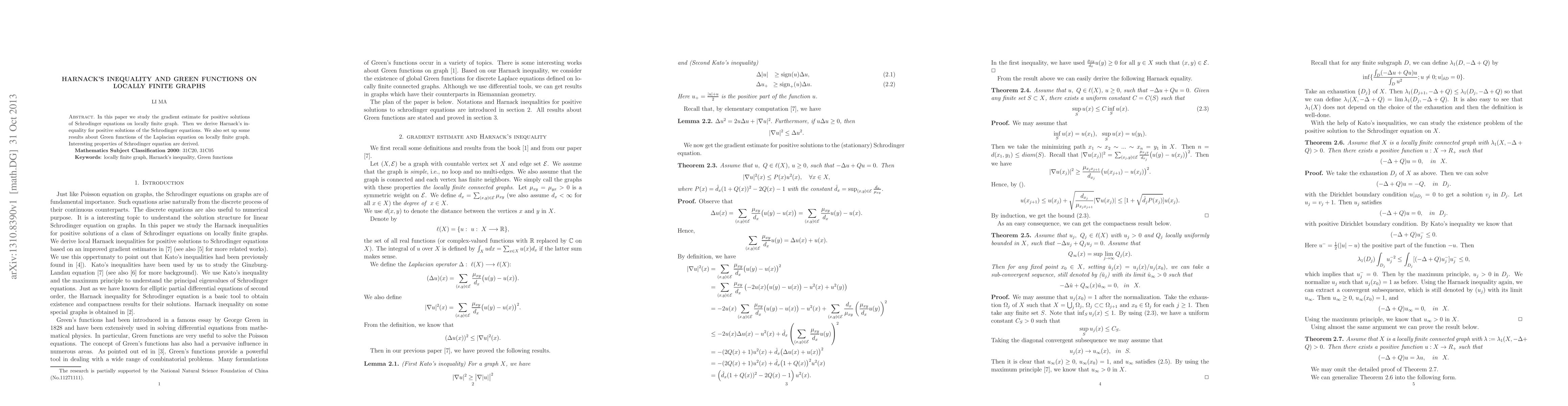 In this paper we study the gradient estimate for positive solutions of Schrodinger equations on locally finite graph. Then we derive Harnack's inequality for positive solutions of the Schrodinger equations. We also set up some results about Green functions of the Laplacian equation on locally finite graph. Interesting properties of Schrodinger equation are derived.